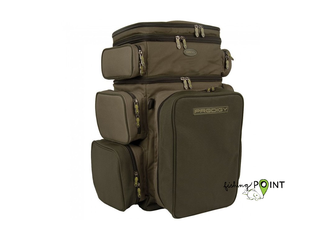 Ruksak je vybaven velkým prostorem v centrální části, decentním izolovaným oddělením pro návnady a mělkou sekcí pro rybářskou výstroj. Ruksak je též vybaven malou, střední, velkou kapsou na stranách a jumbo kapsou na přední straně. Poslední zmíněná kapsa je uzpůsobena přesně pro organizér, který je vlajkovou lodí celé Prodigy řady. Prodigy Klip-Lok® Tackle Base Box, dále je zde 6 menších vnitřních kapes pro malé a střední krabičky Klip-Lok® Base Boxes. Ruksak je ideální zásobárna všech rybářských potřeb, další doplňky: zesílené dno, stojné body, čalouněné záda, opaskový pás, nastavitelné ramenní řemeny, ucho pro přenos, příslušenství pro ukotvení podložky Prodigy Unhooking Mat. Rozměry: Hlavní úložný prostor 45x30x36cm Termokapsa : 15x30x36cm Celkem : 60x30x36cm Váha: 1,4kgDoplňkové parametry