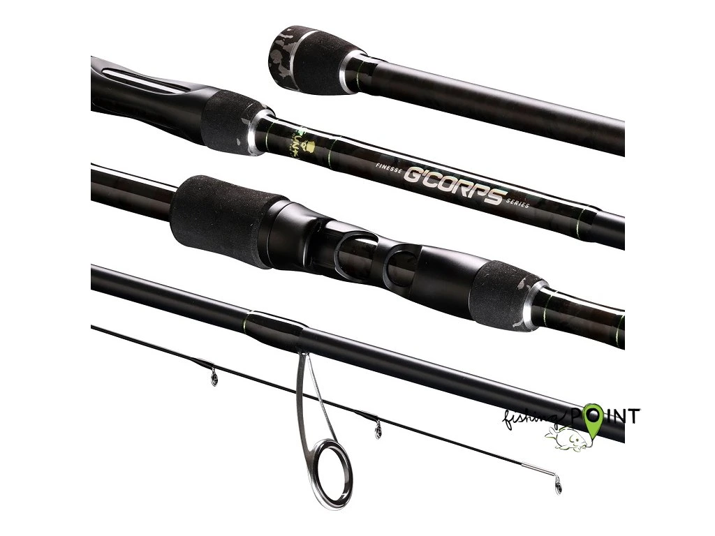 Pruty konstrukčně vyrobené speciálně pro lov s gumovými nástrahami. Dokonale štíhlý blank z uhlíku IM24T je osazený anti-frap SIC očky s velice rychlou špičkovou akcí. Spodní část blanku je velice tuhá a plná skryté síly. Ta je doplněna o lepenou plnou grafitovou špičku pro detekci i těch nejjemnějších záběrů a dokonalé vedení nástrahy. Odlehčená minimalistická dělená rukojeť doplněná o EVA pěnu pro dokonalý kontakt s blankem a přenos záběrů. Pruty jsou vhodné především pro lov candátů, menších štik a okounů. Jemnější modely můžeme použít i na lov pstruhů.G Corps Finesse 220M: délka 220 cm, počet dílů 2, vrhací zátěž 3,5-18 g, skladná délka 115 cm, váha 101 g, počet oček 11.