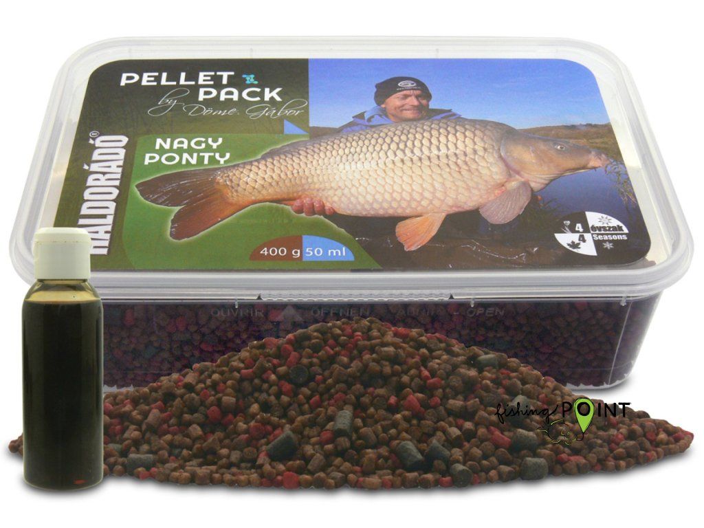 Pelety Pellet Pack, které vyvíjel Döme Gábor. Je dodávaný v praktické plastové uzavíratelné krabičce a její výhodou je, že pomůže uchovat zamíchané krmivo čerstvé mnohem déle. Každá varianta obsahuje 400 g peletek ve velikostech 2, 3 a 4 mm a zároveň 50 ml aroma.Pelety obsahují ty nejlepší složky z léty prověřených Haldorádó krmiv. Barevné pelety, které se rychle rozpuštějí ve vodě, ale přesto se nerozpadnou. Pelety ve velikosti 4 mm jsou halibutky, které měknou pomalu a zůstávají tvrdé i po delší době pod vodou. 50 ml aroma je Pellet Juice, který je velmi husté, koncentrované aroma, které slouží k dodatečnému dochucení krmiva. Každá varianta má své, chuťově příslušející aroma, jenom Mrazivý kapr, má kromě své příchutě ještě 50 ml lahvičku obsahující CSL Tuning Mrazivý Kapr. Doporučený postup pro přípravu krmení:• Krmivo zalijte 100-150 ml vody, následně na něj nalejeme přiložené husté aroma• Dobře protřepeme a odložíme stranou.• Nejlepšího výsledku dosáhnete, pokud krok č.1 uděláte již večer před odjezdem na ryby, aby peletky změkly a nasály aroma• Po 20-60 minutách (v závislosti na teplotě) jsou pelety připravené k použití a můžeme je plnit do krmítka• Takto připravená verze tohoto krmiva bude mít velmi intenzivní příchuť a aroma, které budou ve vodě velmi atraktivníDoplňkové parametry