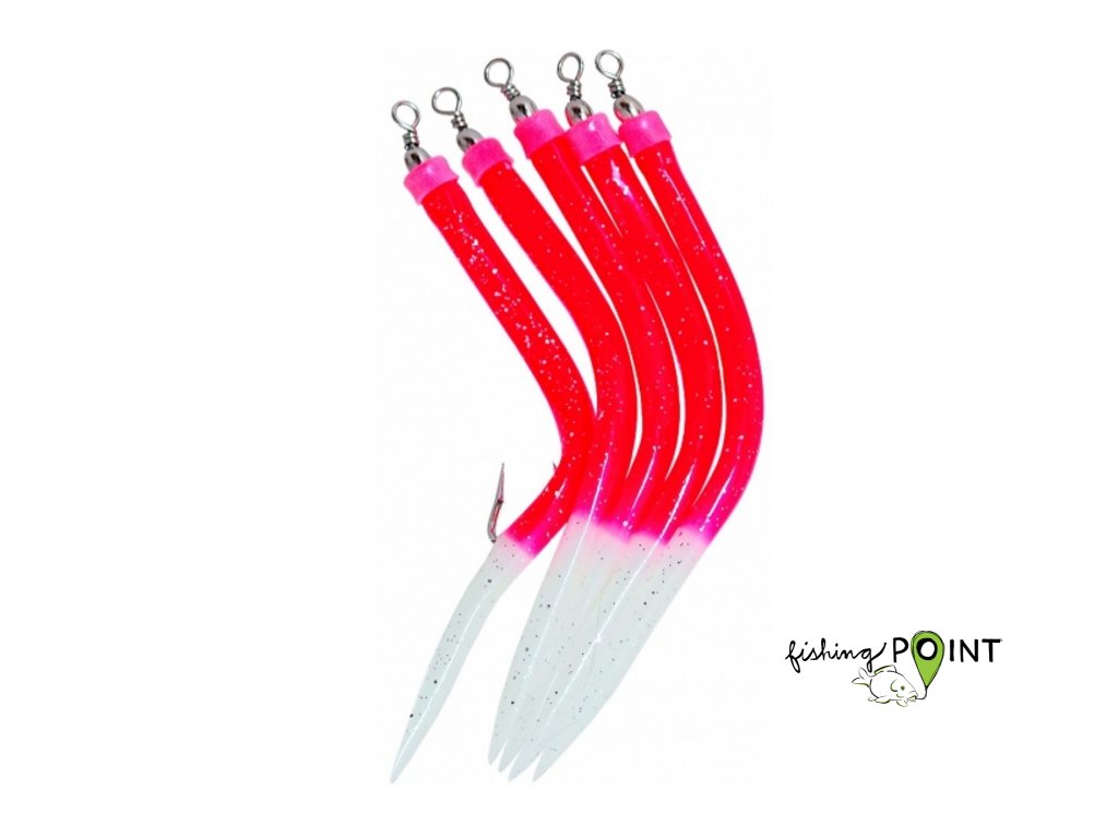 Červené trubičky s flitry a fosforovým ocáskem. Absolutně nej nástraha na tresky obecné a kelery. Tato nástraha je hojně používaná Nory, kteří na ni loví z kutrů na kolečko. Pokud pojedete na velké tresky, použijte k vytvoření návazců vlasec o průměru 0.80mm až 1mm.V balení :5ks
