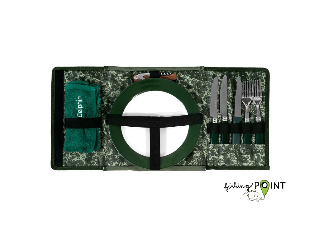 Jídelní souprava, která vám iv odlehlých oblastech kempování dopřeje komfort civilizace :) V chytře složeném setu naleznete úhledně uložené dva plastové talíře, multifunkční nůž (otevírá