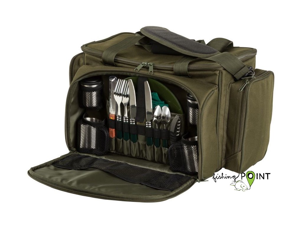 Exkluzivní jídelní taška Defender Session Cooler Food Bag na jídlo s kuchyňským nadobím od anglické značky JRC. Vnitřní izotermický prostor je jednoduše omyvatelný a ideálně izolovaný pro uchování stále teploty. Na vrcholu se nachází víko, které je na zip. Po bocích tašky jsou menší kapsy, do kterých můžete vložit drobnosti. V přední části je velká kapsa, kde je uloženo všechno nadobí. Celá taška je vyrobena z vodě odolného zeleného 500D polyesterového materiálu, který jde lehce očistit. Jsou zde použity kvalitní X-strong zipy s logem JRC. Na vrchní části se nacházejí dvě madla, první kratší pro uchopení do ruky a druhé delší pro pohodlný transport na delší zvdálenosti. Součástí jídelní tašky je: - 2 hliníkové pohárky - 2 hlíníkové vzduchotěsné nádoby na sůl, koření nebo cukr - 2 plastové talíře - 2 vidličky - 2 příborové nože - nůž na steaky nebo ovoce - 2 čajové lžíce - 2 utěrky - multifunkční nůž s otvírákem na víno a sklenky Rozměr: 53 x 30 x 30cmDoplňkové parametry
