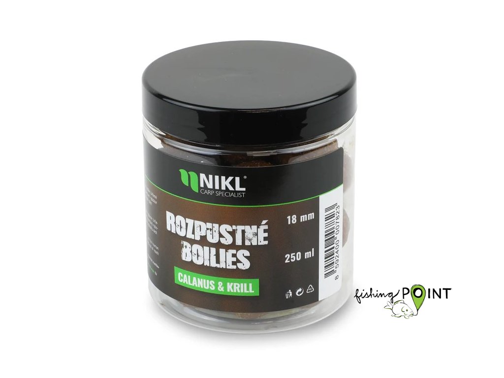 Nikl Rozpustné boilies Calanus & Krill je kulaté, rychle pracující boilies, které vychází z konceptu známých Attract Hookers. Vyznačuje se intenzivním korýším aroma a specifickou chutí drobných korýšů, doplněnou o krillovou složku, která vytváří mimořádně silný potravní signál. Tato příchuť je účinná na aktivní ryby i na opatrné jedince, protože působí výrazně, ale zároveň přirozeně, takže kapry neodrazuje ani na tlakových vodách. Rozpustné boilies Calanus & Krill je navrženo tak, aby pomohlo docílit záběru v co nejkratším čase. Obsahuje vysokou dávku tekutých i práškových složek, které se díky speciálně upravenému mixu začínají uvolňovat okamžitě po dopadu do vody. Tím vzniká silná pachová stopa, která se rychle šíří okolím, navádí ryby k montáži a dokáže nastartovat záběr i ve chvílích, kdy je aktivita kaprů nízká. Calanus & Krill je perfektní volbou pro situace, kdy potřebujete rychlou, efektivní a okamžitě fungující nástrahu. Díky rozpustnosti pracuje spolehlivě i během krátkých vycházek nebo při závodním lovu, kde rozhoduje každá minuta. Korýší profil dokáže ryby vyprovokovat i na prochytaných revírech, protože vytváří čitelné potravní impulsy a pomáhá udržet zájem ryb v okolí lovného místa.