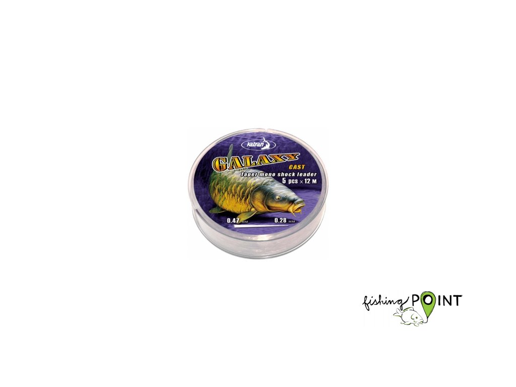 Galaxy Cast - 5 x 12m na cívce 0,47 mm tlustý plátek 6 metrů dlouhý, zůžen do kuželu 4 metry dlouhý a jemnější část - o průměru 0,26 mm, 0,28 mm a 0,30 mm délka 2 metry.