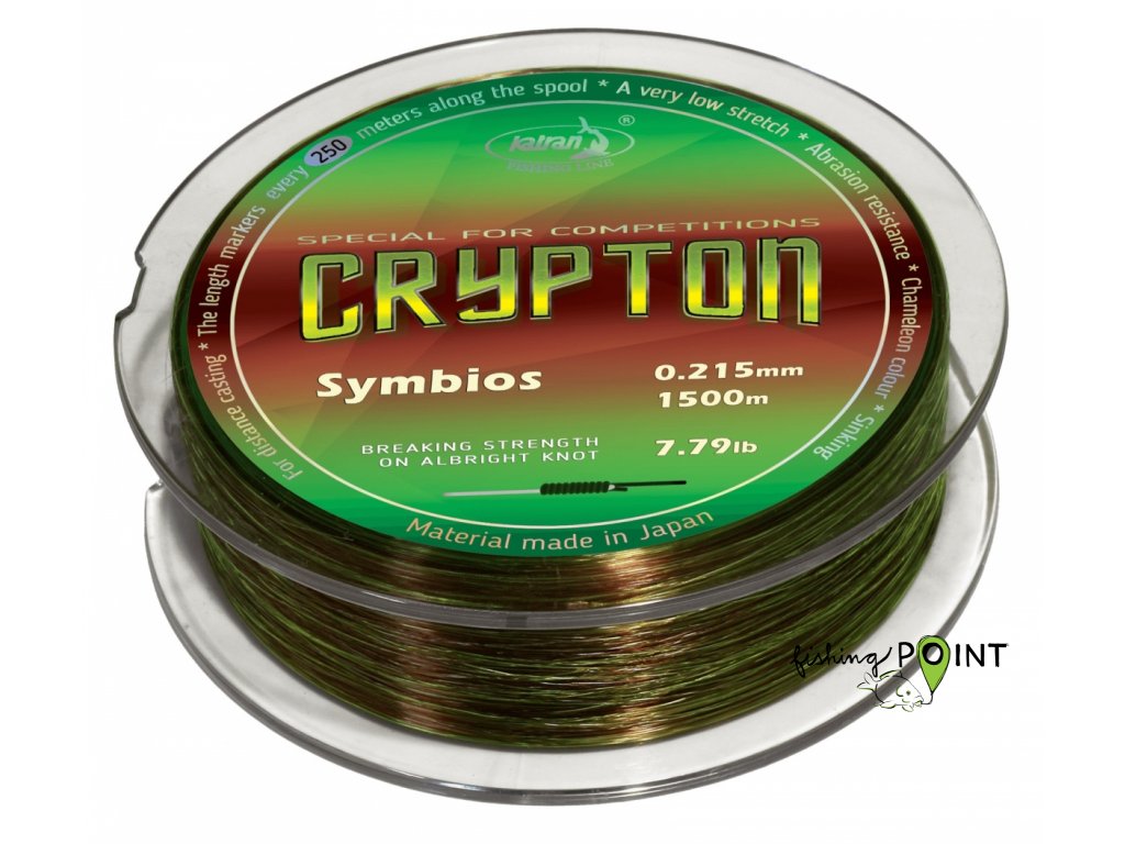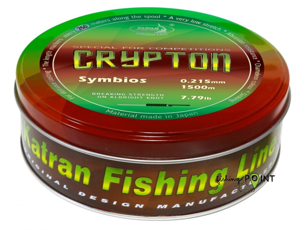 Crypton Symbios - Navržen pro lov na velké odhozové vzdálenosti.Tento vynikající vlasec Crypton Symbios, vznikl použitím nových nejmodernějších materiálů a nejnovější technologie při výrobě.Díky tomu se stal rybářským vlascem nejvyšší kvality a jeho poměr pevnosti v daném průměru je nejlepší v celé nabídce Katran.Skládá ze střídavých úseků : 50 cm NEON barvy, "perfektně rozjasní váš vlasec při nasvícení v noci", a 50 cm s barvou přispůsobující okolnímu prostředí,"Inovativní technologie odrazu světla, která maskuje vlasec na jakémkoli dně".Vysoká pevnost v uzlu, nízká paměť a vynikající koeficient průtažnosti 13-14%jsou další cenné výhody Crypton Symbios.Je velice otěruvzdorný, pokryt leštěným povrchem, který chrání vlasec před usazením prachu a nečistot, takže zůstane čistý a hladký dlouho dobu.Díky tomu perfektně prochází očky a zvyšuje odhozové vzdálenosti.Každých 250 metrů najdete speciální značky zobrazující zbytek vlasce na cívce. Oceníte při navijení vlasce na cívku vašeho navijáku.Baleno do kovových plechovek, které jej dokonale chrání před ultrafialové zářením a mechanické poškození.214103 7,79 Lb 3,53 kg 0,215 mm 1500 m214110 9,54 Lb 4,33 kg 0,234 mm 1250 m214127 11,69 Lb 5,30 kg 0,261 mm 1250 m214134 12,78 Lb 5,80 kg 0,286 mm 1000 m 189210 17,5lb 7,938kg 0,331mm 1000mHledání nejlepší barevné kombinace.Hlavní myšlenkou četných experimentů je učinit vlasec neviditelným na dně pro ryby (50cm) Crypton materiálu a zároveňposkytují rybáři možnost vidět a ovládat vlasec i za šera a tmy nabarvili jsme úsek (50 cm) v Neonové barvě .Ryba stále vidí jen několik nespojených úseků to ji neznepokojuje a může poklidně plavat i přes vlasec.Doplňkové parametry