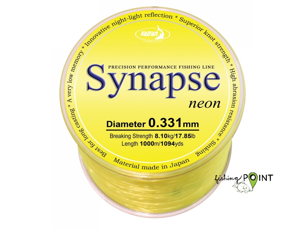 Jsme hrdí na to, že můžeme představit zbrusu nový Synapse Neon, který používají kapraři z celé evropy pro dosažení etxrémních odhozových vzdáleností až na hranici 200m. Hladký, fluorescenční, rychle potápivý vlasec s nízkou průtažností a vysokou pevností v uzlu je pod vodou vidět mnohem méně, než jakékoliv jiné barevné vlasce. Naopak při nasvícení světlem odráží světlo, takže tento vlasec doporučujeme při lovu v noci.Balený v plechové krabičce s kapacitou 1000 metrů