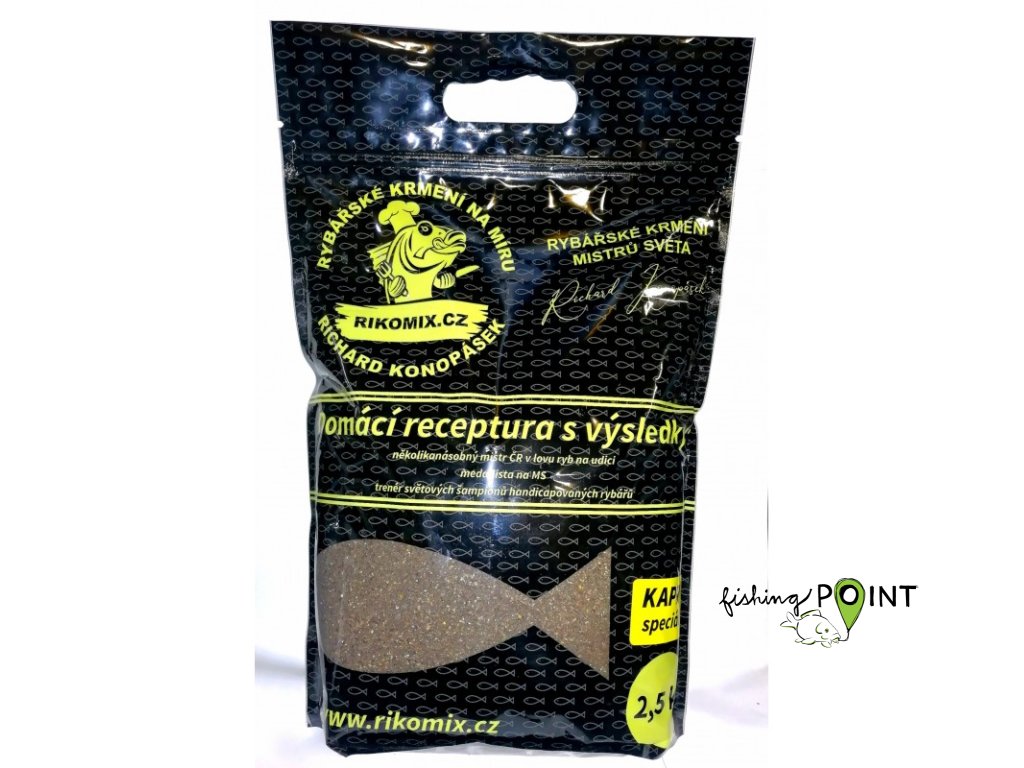 Rybářské krmení Richard Konopásek - RIKOMIX KAPR SPECIÁL ČERNÉ V NOVÉM BALENÍ 2,5KG. UZAVÍRATELNÉ SÁČKY NEPROPOUŠTĚJÍCÍ AROMATA!Podmínky rybářských závodů všech úrovní jsou však každopádně jedním z nejúčinnějších prostředí k ověření praktické účinnosti speciálních krmných směsí a přípravků.Právě léta závodnické praxe a kvanta získaných zkušeností vedly k odladění řady směsí, které jsou koncipovány jako univerzální nebo specializované pro jednotlivé typy vod a cílové druhy ryb.Bude to možná znít divně, ale je holým faktem, že připravuji vždy ty nejlepší možné směsi pro všechny rybáře, kteří moje krmení používají. Žádné tajemstvíčka a specialitky pouze pro sebe a nějak "ošizené" krmení pro ostatní. Pro leckoho to může být těžko uvěřitelné, ale je to tak.Ze stejného balení se dělím o krmení se svými potenciálními konkurenty na závodech a stejnou směs namíchám každému rybáři, který o ně projeví zájem.