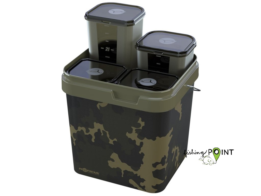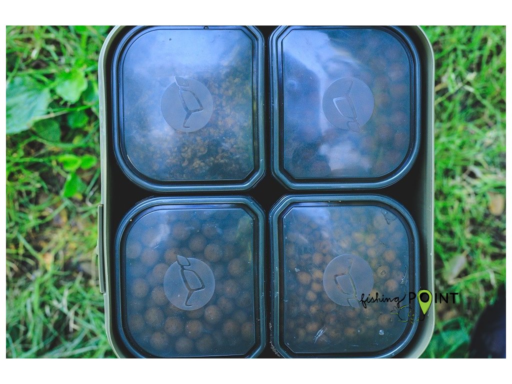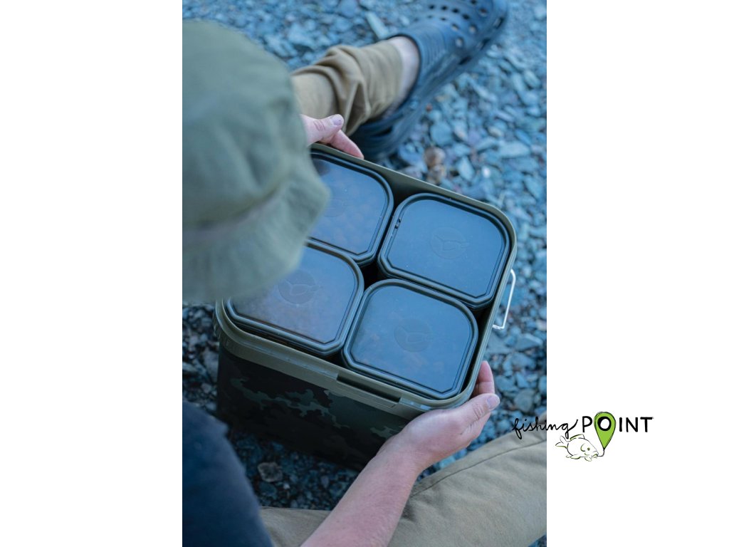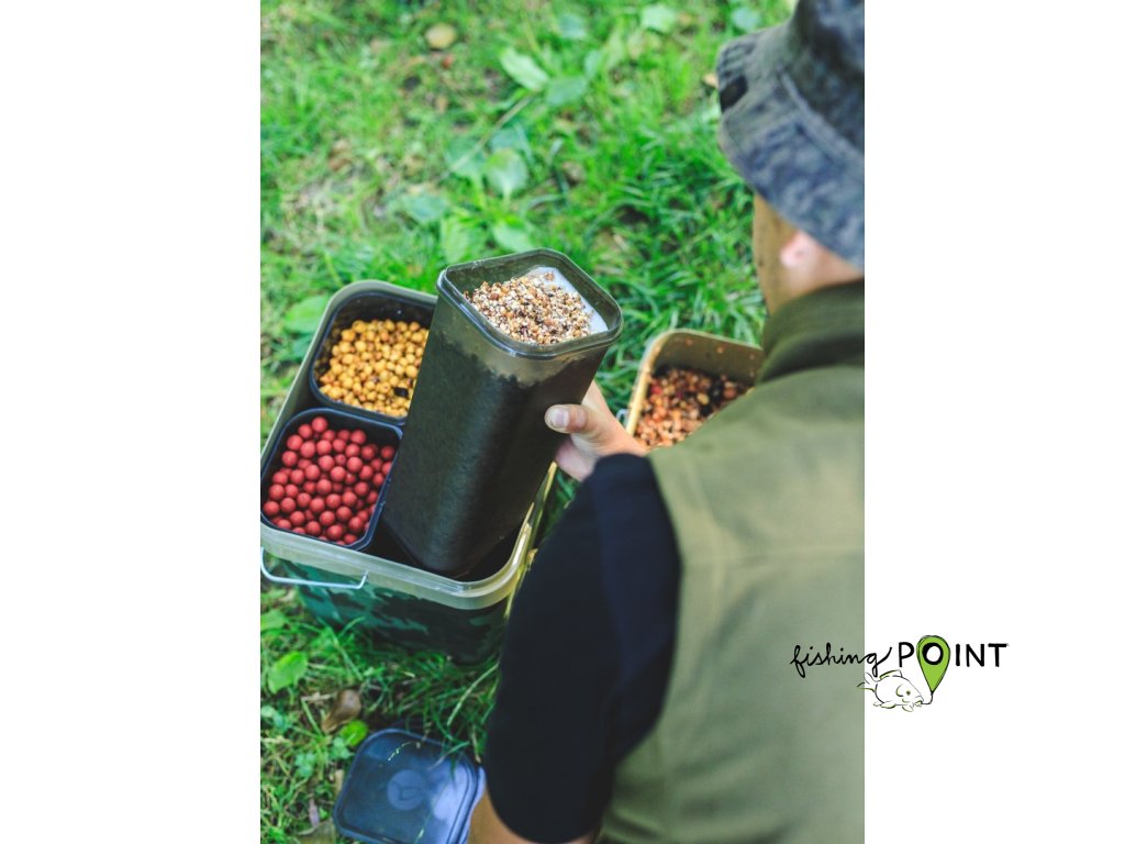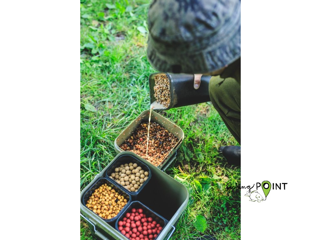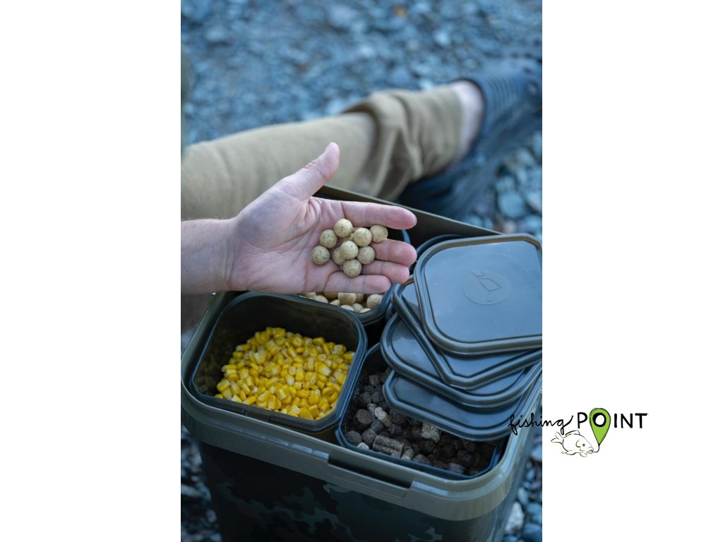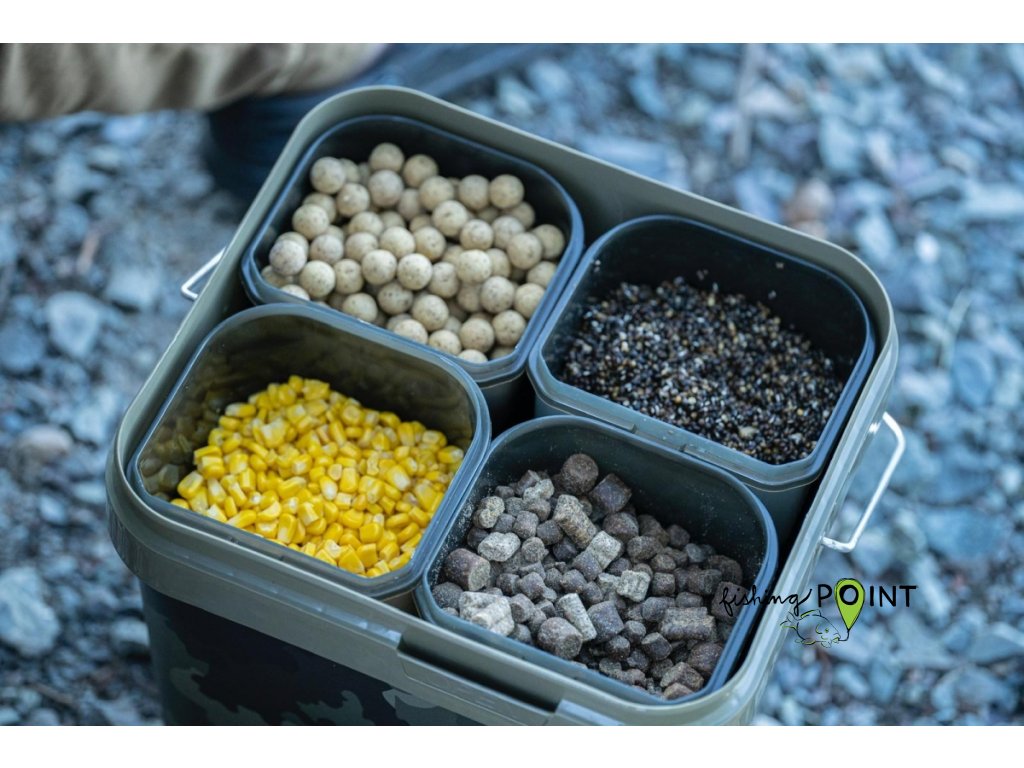 Tento praktický systém má objem 17 litrů a je dodáván se čtyřmi samostatnými boxy, z nichž každý lze naplnit něčím jiným a kde buď nechcete míchat všechny návnady dohromady, nebo je chcete připravit přímo na místě. Díky tomu je vhodný pro situace, kdy chcete krmit návnadami různých velikostí, a poskytuje vám snadný přístup ke všem návnadám v jednom kbelíku, avšak stále vám umožňuje mít vše rozdělené dle vaší potřeby – na rozdíl od toho, kdy je smícháte dohromady. Je také skvělý při použití spodových směsí, které obsahují drobné částice a pelety, a kde míchání předem může způsobit, že některé druhy krmení, jako je konopí, vyschnou a plavou, nebo se pelety rozpadnou více, než byste chtěli.