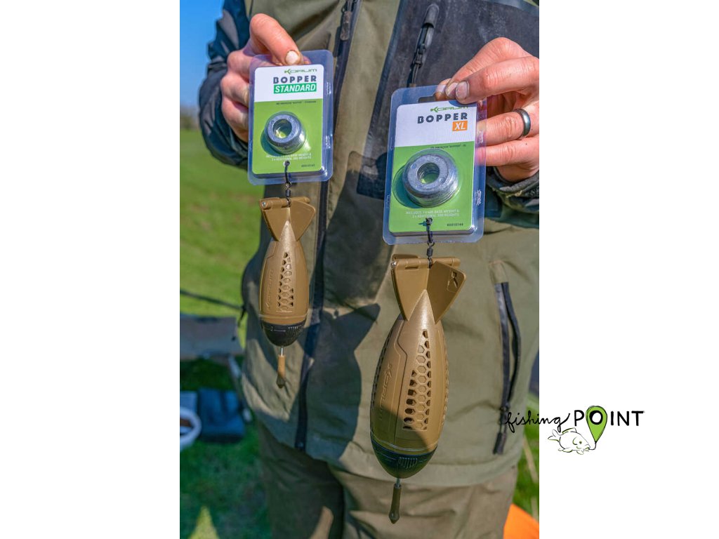 Nejlepší Bait Bopper na návnady. Korum Bopper je vybaven unikátním dovažovacím systémem, kde lze pomocí vyměnitelných závaží nastavit nejen rychlost potápění ale i hmotnost Bopperu. Závaží má tvar koblihy a dává se do na vnitřní části tělícka. Závaží mohu být zajištěné na místě malým ručním kolečkem uvnitř tělíčka. To dává rybářum poprvé možnost jemně upravit hmotnost svého Bait Bopperu. A co víc, samotný Bopper byl navržen tak, aby byl velmi aerodynamický díky tvaru rakety, který volně létá vzduchem a propadá vodou. Krřdélka vzadu stabilizují Bopper, což zajištuje, že ho mužete velmi přesne nahazovat. Hlavní část s dutinou je vyrobena ze dvou částí, které jsou pružinové, aby se otevřely, když Bopper narazí na dno reky nebo jezera. Samotné tělo má otvory, aby bylo mnohem snazší ho stáhnout zpět v rychle tekoucí vodě. Plnění návnady dovnitř Bopperu je snadné a díky tvaru hlavní dutiny se dovnitř vejde mnohem více návnad, než do podobných produktu. Dostupné jsou dvě velikosti Bopperu, které vyhovují různým požadavkům a každou verzi lze použít s vnitřním závažím nebo bez něj dle potreby. Možnost učinit jej těžším, pokud je průtok mnohem vyšší, určite bude vyhovovat spoustě rybárů, lovících na řekách a s feederem.