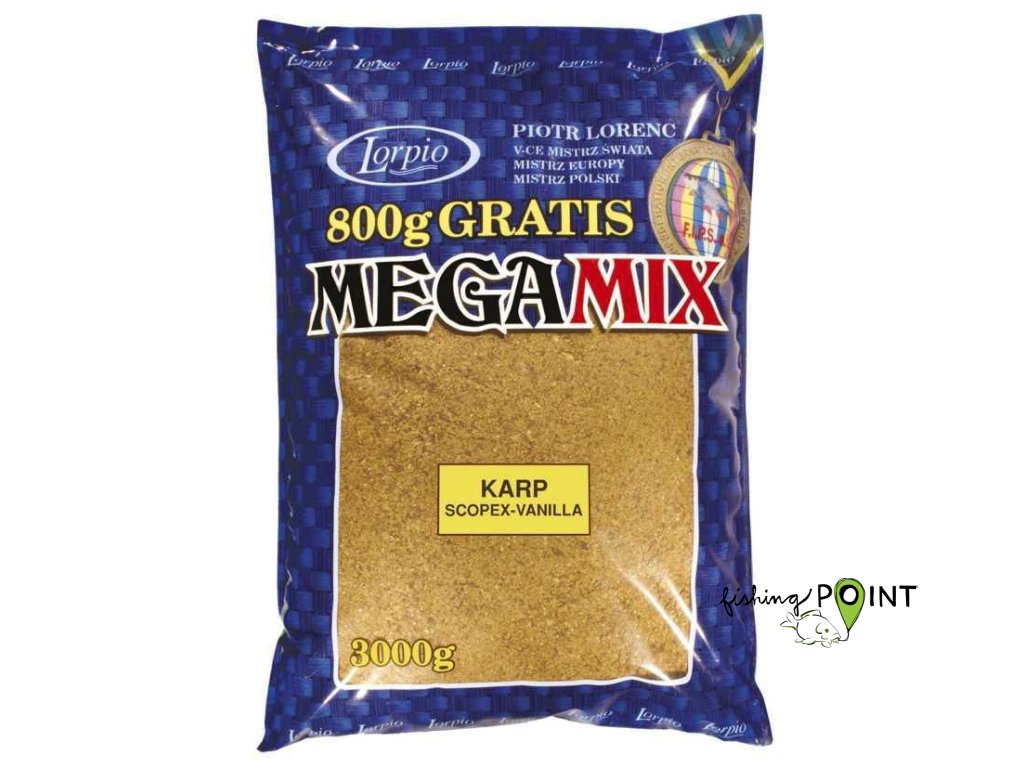 Směs pro vnadění velkých kaprů a kaprovitých ryb – Lorpio Megamix je vyrobena z kukuřičných a obilných šrotů, pekárenských a cukrářských výrobků, chuťových a pachových stimulátorů a doplněna o další speciální přísady a také řadu bioaktivátorů povzbuzujících zvýšené přijímání potravy.