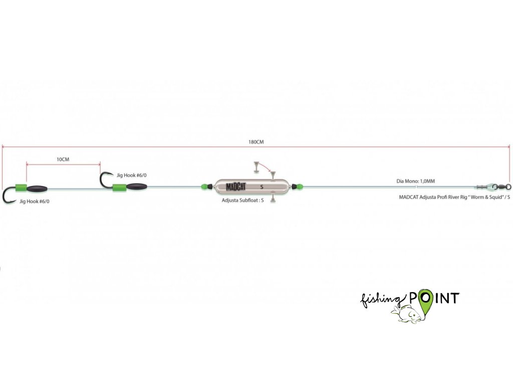 Montáže s podvodním splávkem MADCAT® Adjusta Subfloat pro rybaření pro rybaření s žížalami a nebo olihněmi na dně rychle tekoucích řek. Jsou vázány z 1,00mm silného vlasce MADCAT® Ultra-soft Mono Leader. K dispozici ve třech velikostech: S, M a L (odpovídající velikosti háčků: 6/0, 8/0 a 10/0). Celková délka: 180cm. Nosnost: 100lb.