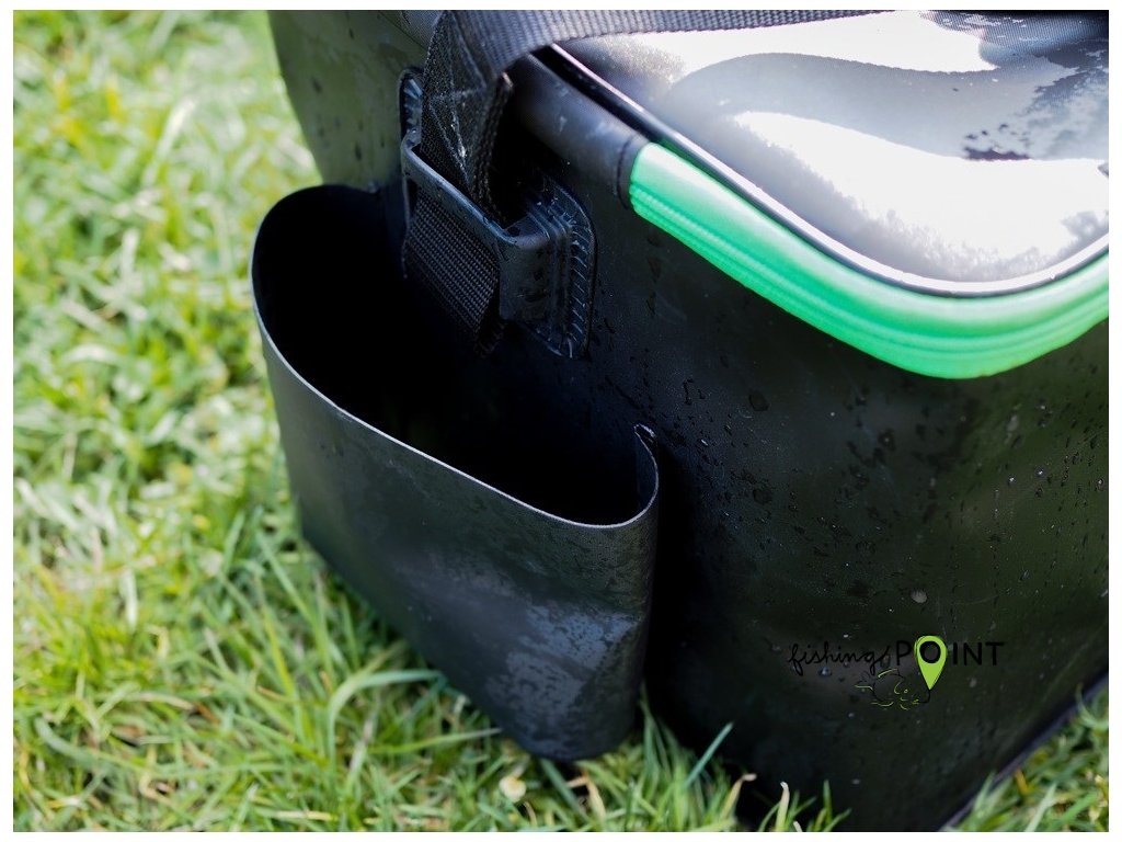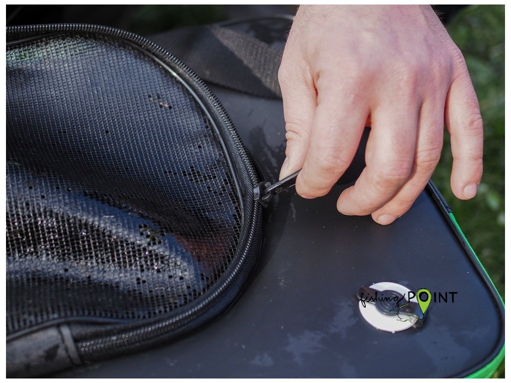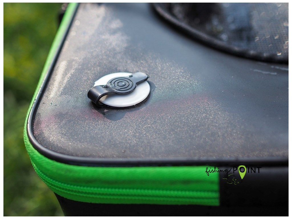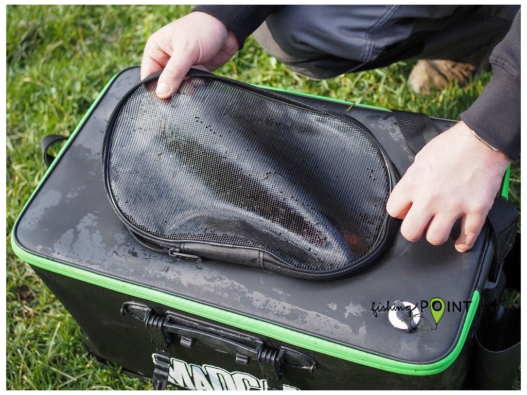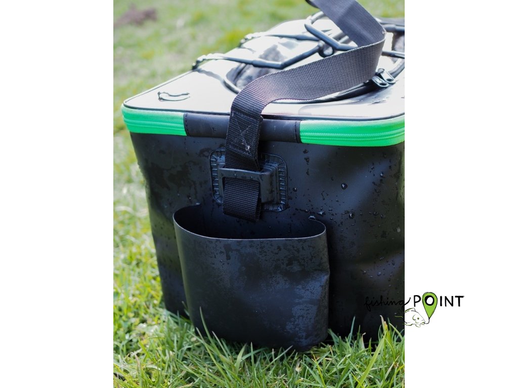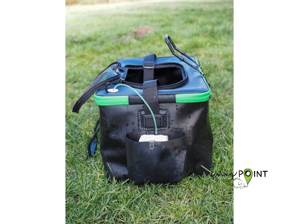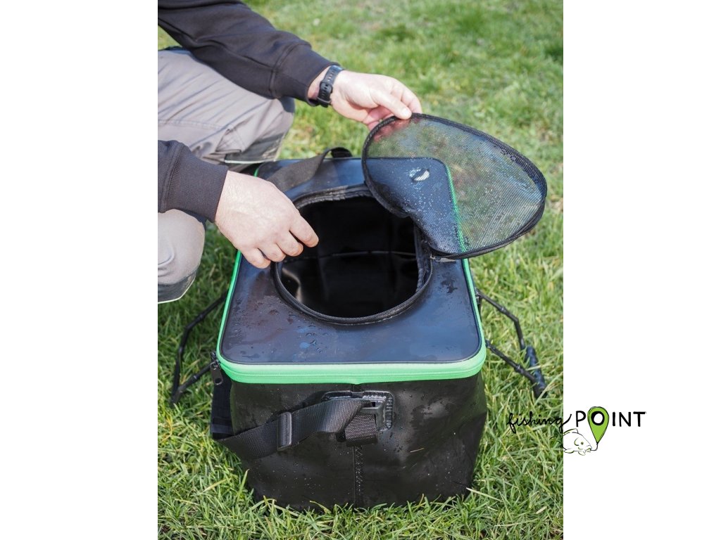 Skládací 50litrový kbelík na živé návnady z materiálu EVA s pevným popruhem, odolnými držadly a kapsou na vzduchovač v blízkosti 8mm otvoru ve víku. Ve víku se nachází otvor z jemné pogumované síťoviny pro snadné vyndávání živé nástrahy.