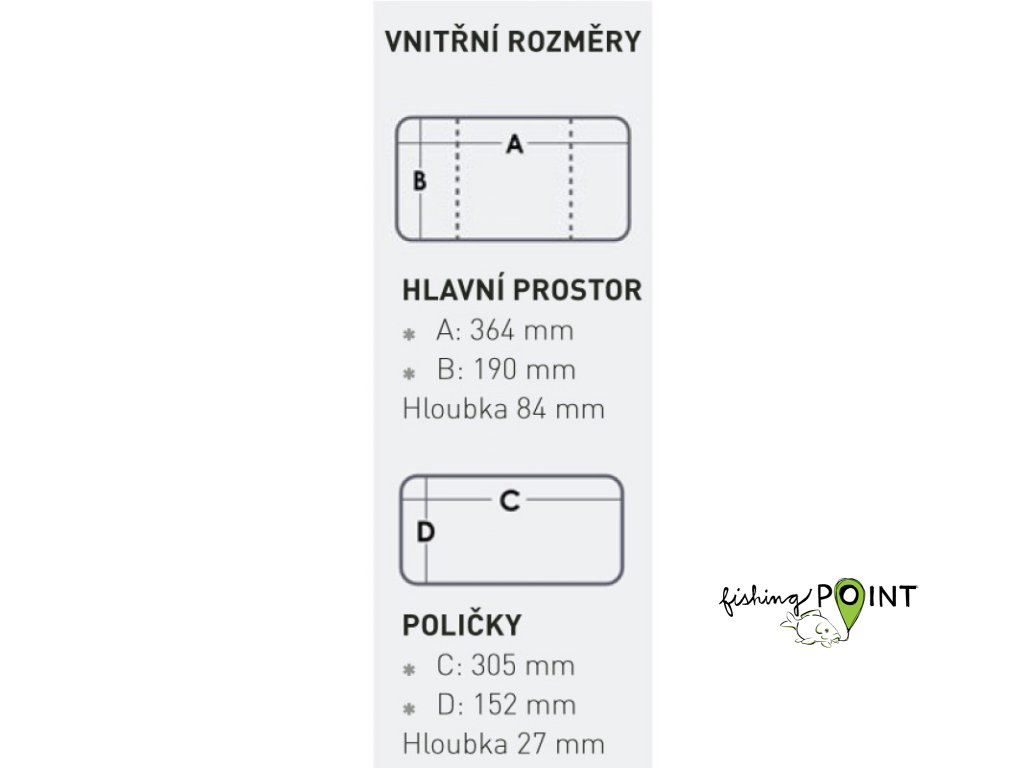 18 variabilních přepážek + 2 přepážky na třpytky nebo wobblery. Materiál: Nárazuvzdorný kopolymer. Přihrádky Worm Proof.