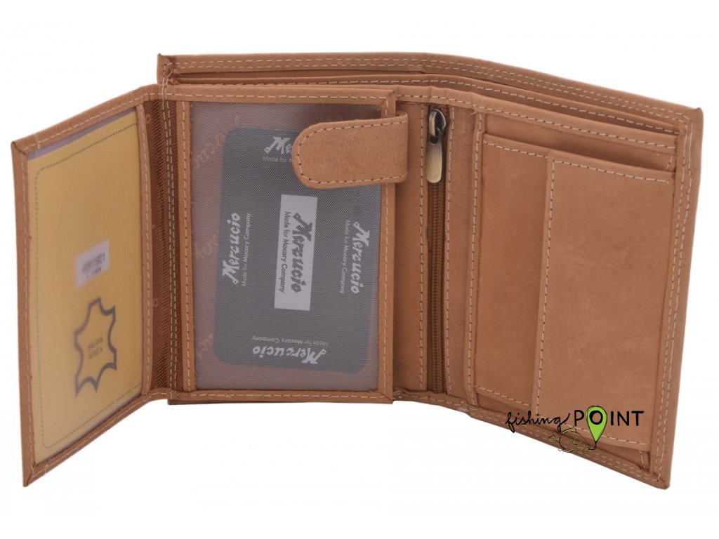 Šikovný model pánské kožené peněženky je dostupný v několika barevných variacích, ale jednoznačně nejoblíbenější je světle hnědá barva, která s sebou nese i několik desítek laserových nebo embosovaných vzorů. Tento model patří do kategorie klasické kožené peněženky orientované na výšku s vnitřním zapínáním. Obsahuje několik složek na karty a doklady. Samozřejmě nesmí chybět ani přihrádky na bankovky a velký mincovník. Obvod peněženky je příjemně a nerušivě zdoben obšitím.Členění peněženky:- 8 přihrádek na karty- 2 průhledné přihrádky na doklady- 2 vnitřní univerzální přihrádky- 1 zipová složka- 1 velký mincovník- 2 složky na bankovkyRybářské vzory jsou spolu s mysliveckými jednoznačně nejoblíbenějšími ve své kategorii. V nabídce jsou peněženky a obaly na doklady s laserovými nebo embosovanými designy od výmyslu světa. V nabídce jsou různé druhy ryb, například kapr, candát, sumec nebo pstruh, jakož i různé rybářské vzory, jako například lesnice, rybář, rybaření, a mnoho dalších. Všechny laserové vzory jsou dodávány u nás ve skladu laserovým vypalováním do kůže peněženky, zatímco embosované vzory jsou vtiskovány do kůže při výrobě peněženky. Všechny laserové a embosované peněženky jsou vyrobeny z hovězí kůže v úpravě HUNTER.Tato peněženka je vyrobena z hovězí kůže v úpravě hunter a je velmi populární u lidí, kteří mají rádi rustikální a přírodní styl. Kůže je zpracována a barvena podobným způsobem jako semiš, a tedy zachovává si poněkud drsný povrch. Jednou z typických vlastností pro peněženky z kůže hunter je to, že aktivním používáním se díky olejovému základu vytvoří patina, což znamená, že peněženka přirozeně ztmavne. Samozřejmou součástí tohoto typu kůže je její nedokonalý charakter, díky kterému je každá jedna peněženka odstínově unikátní, a tudíž je velmi obtížné zachytit jeden univerzální odstín nebo dokonce dokonalý povrch bez přirozených „fleků".Značka: Mercucio