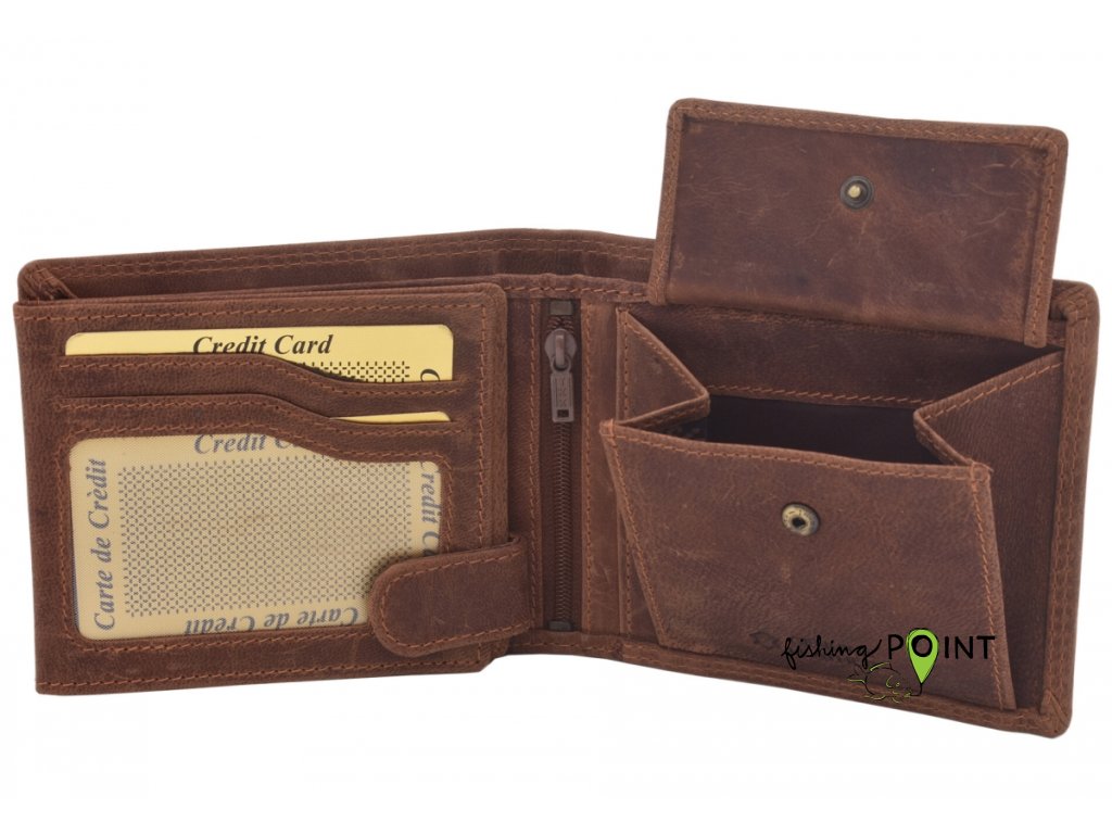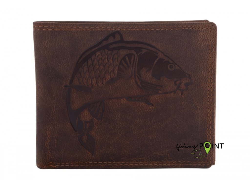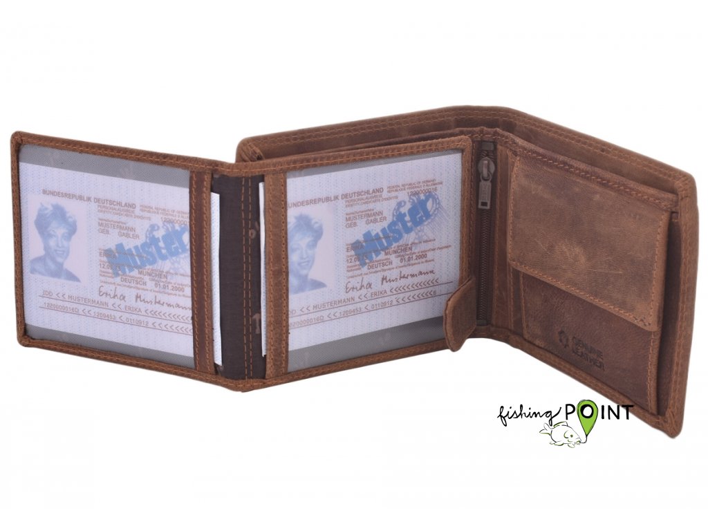 Kožená pánská peněženka z kvalitní kůže nabídne přesně ten komfort, který majitel dobré peněženky potřebuje. Tento model obsahuje několik chytrých přihrádek na karty a osobní doklady. Rovněž nezapomíná ani na fotky, které si můžete umístit do průhledných přihrádek. Na uschování mincí poslouží velká kapsa na mince nebo i zipová přihrádka uprostřed peněženky, která však může být využita univerzálně. Klasickým prvkem jsou dvě přepážky na bankovky.Členění peněženky:- 9 přihrádek na karty- 3 průhledné přihrádky na fotky nebo doklady- 2 vnitřní univerzální přihrádky- 1 velký mincovník- 1 zipová složka- 2 přepážky na bankovkyRybářské vzory jsou spolu s mysliveckými jednoznačně nejoblíbenějšími ve své kategorii. V nabídce jsou peněženky a obaly na doklady s laserovými nebo embosovanými designy od výmyslu světa. V nabídce jsou různé druhy ryb, například kapr, candát, sumec nebo pstruh, jakož i různé rybářské vzory, jako například lesnice, rybář, rybaření, a mnoho dalších. Všechny laserové vzory jsou dodávány u nás ve skladu laserovým vypalováním do kůže peněženky, zatímco embosované vzory jsou vtiskovány do kůže při výrobě peněženky. Všechny laserové a embosované peněženky jsou vyrobeny z hovězí kůže v úpravě HUNTER.Tato peněženka je vyrobena z hovězí kůže v úpravě hunter a je velmi populární u lidí, kteří mají rádi rustikální a přírodní styl. Kůže je zpracována a barvena podobným způsobem jako semiš, a tedy zachovává si poněkud drsný povrch. Jednou z typických vlastností pro peněženky z kůže hunter je to, že aktivním používáním se díky olejovému základu vytvoří patina, což znamená, že peněženka přirozeně ztmavne. Samozřejmou součástí tohoto typu kůže je její nedokonalý charakter, díky kterému je každá jedna peněženka odstínově unikátní, a tudíž je velmi obtížné zachytit jeden univerzální odstín nebo dokonce dokonalý povrch bez přirozených „fleků".Doplňkové parametry