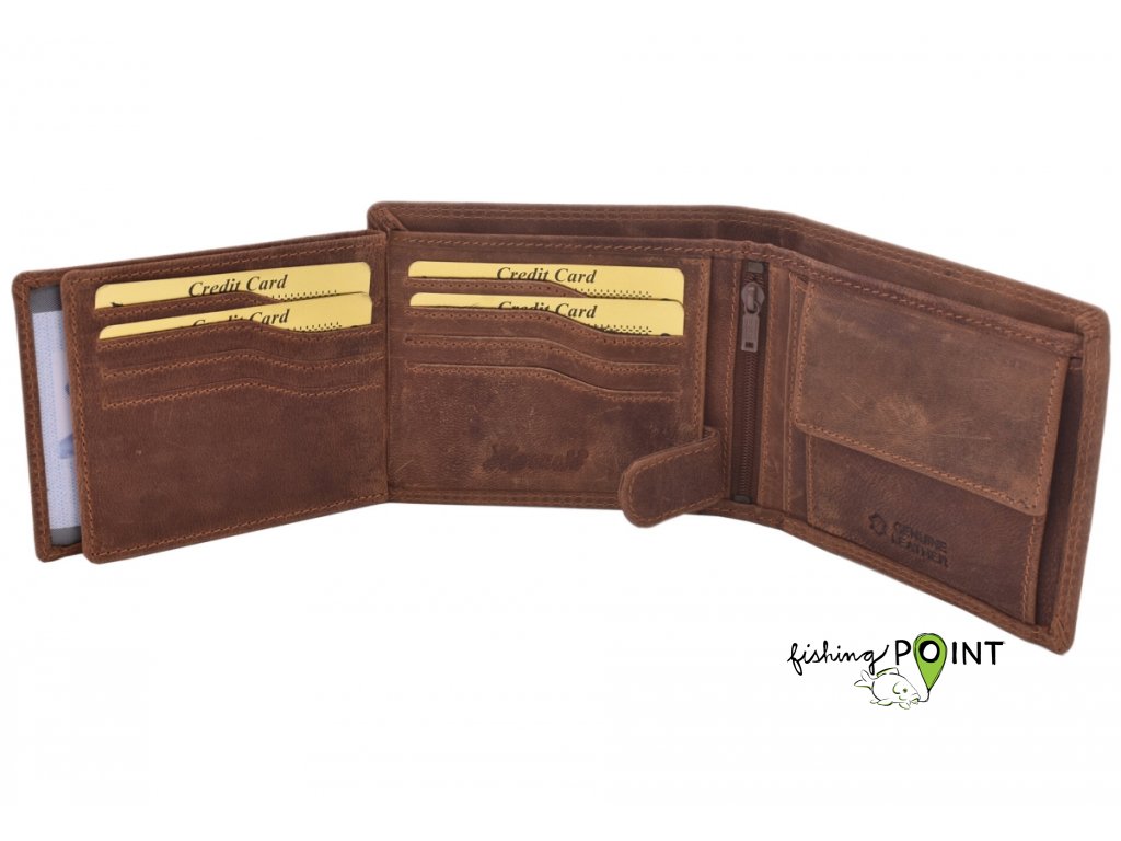 Kožená pánská peněženka z kvalitní kůže nabídne přesně ten komfort, který majitel dobré peněženky potřebuje. Tento model obsahuje několik chytrých přihrádek na karty a osobní doklady. Rovněž nezapomíná ani na fotky, které si můžete umístit do průhledných přihrádek. Na uschování mincí poslouží velká kapsa na mince nebo i zipová přihrádka uprostřed peněženky, která však může být využita univerzálně. Klasickým prvkem jsou dvě přepážky na bankovky.Členění peněženky:- 9 přihrádek na karty- 3 průhledné přihrádky na fotky nebo doklady- 2 vnitřní univerzální přihrádky- 1 velký mincovník- 1 zipová složka- 2 přepážky na bankovkyRybářské vzory jsou spolu s mysliveckými jednoznačně nejoblíbenějšími ve své kategorii. V nabídce jsou peněženky a obaly na doklady s laserovými nebo embosovanými designy od výmyslu světa. V nabídce jsou různé druhy ryb, například kapr, candát, sumec nebo pstruh, jakož i různé rybářské vzory, jako například lesnice, rybář, rybaření, a mnoho dalších. Všechny laserové vzory jsou dodávány u nás ve skladu laserovým vypalováním do kůže peněženky, zatímco embosované vzory jsou vtiskovány do kůže při výrobě peněženky. Všechny laserové a embosované peněženky jsou vyrobeny z hovězí kůže v úpravě HUNTER.Tato peněženka je vyrobena z hovězí kůže v úpravě hunter a je velmi populární u lidí, kteří mají rádi rustikální a přírodní styl. Kůže je zpracována a barvena podobným způsobem jako semiš, a tedy zachovává si poněkud drsný povrch. Jednou z typických vlastností pro peněženky z kůže hunter je to, že aktivním používáním se díky olejovému základu vytvoří patina, což znamená, že peněženka přirozeně ztmavne. Samozřejmou součástí tohoto typu kůže je její nedokonalý charakter, díky kterému je každá jedna peněženka odstínově unikátní, a tudíž je velmi obtížné zachytit jeden univerzální odstín nebo dokonce dokonalý povrch bez přirozených „fleků".Značka: Mercucio