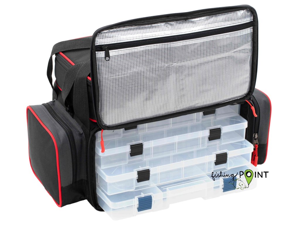 Velká brašna s krabičkami, popruhem na rameno a madlem je rozdělena na dvě hlavní komory. Horní část skvěle poslouží k uložení větších předmětů, zatímco spodní část vybavena boxy je určena pro uložení příslušenství a návnad.