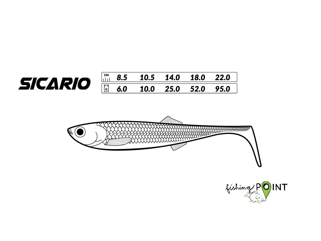 Díky realistickému vzhledu, intenzivní akci ocásku a výraznému chvění těla je měkká nástraha Sicario mimořádně efektivní pro lov různých druhů predátorů. Menší velikosti přilákají okouna a candáta; větší vám určitě přinesou štiku.