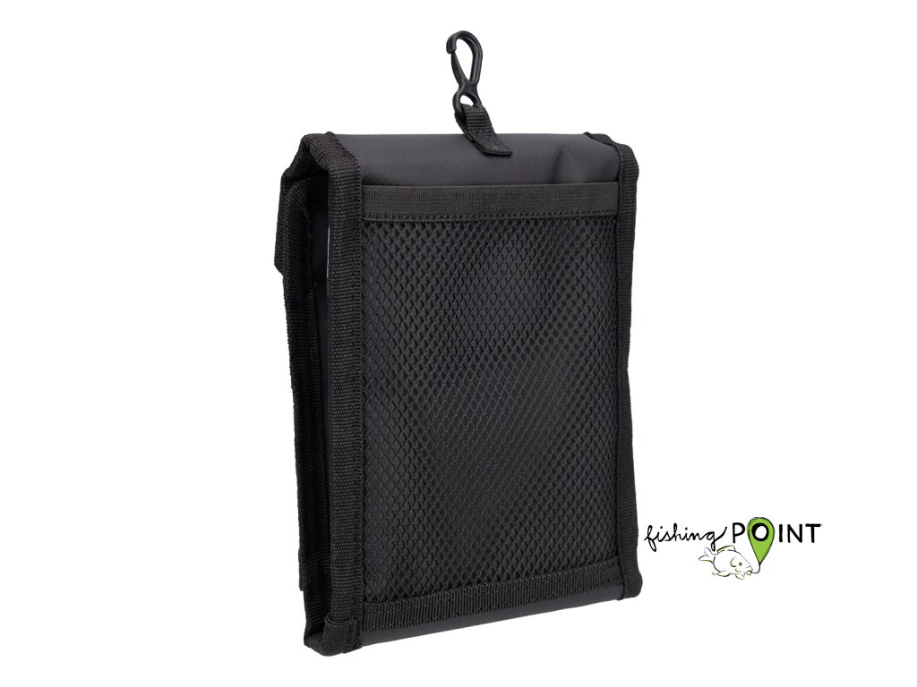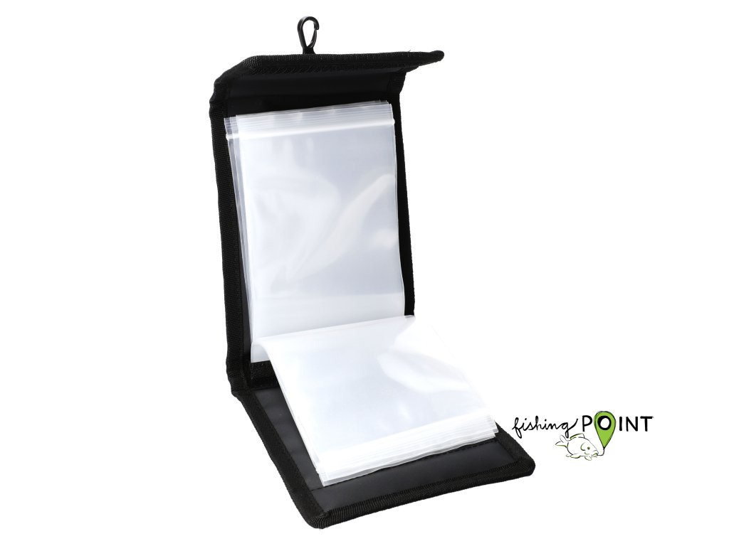 Rybářská taška z odolného materiálu, vybavená 10 pytlíčky na nástrahy a příslušenství. Další vnější síťovaná kapsa usnadňuje organizaci a karabina umožňuje připevnit pouzdro na opasek nebo tašku.