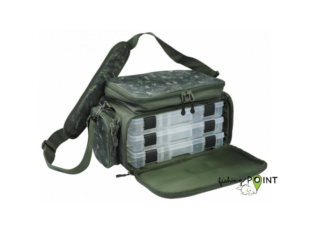 Taška na rybářské doplňky, vybavená krabičkami.Doplňkové parametry