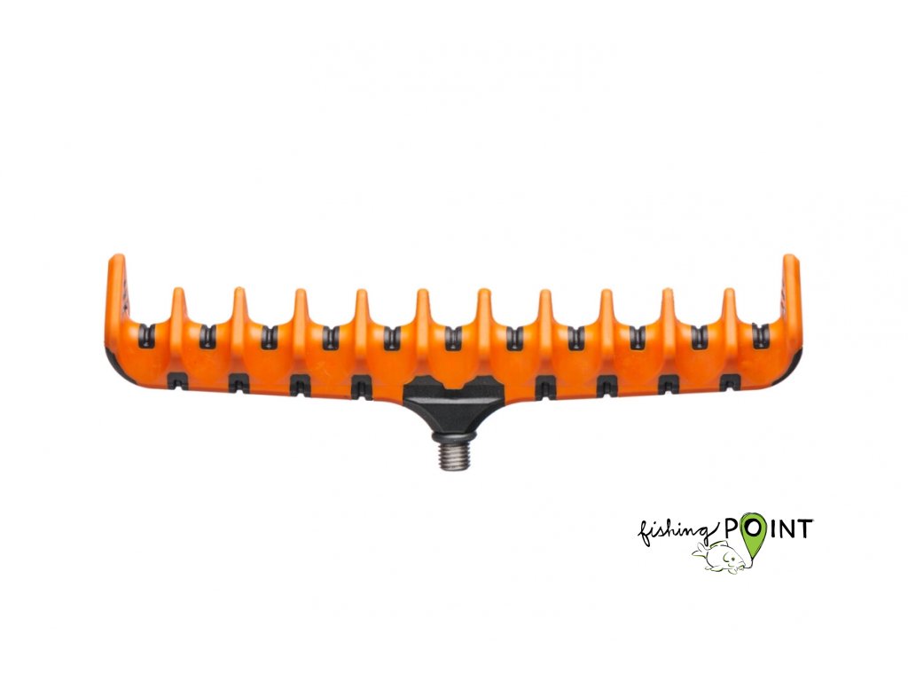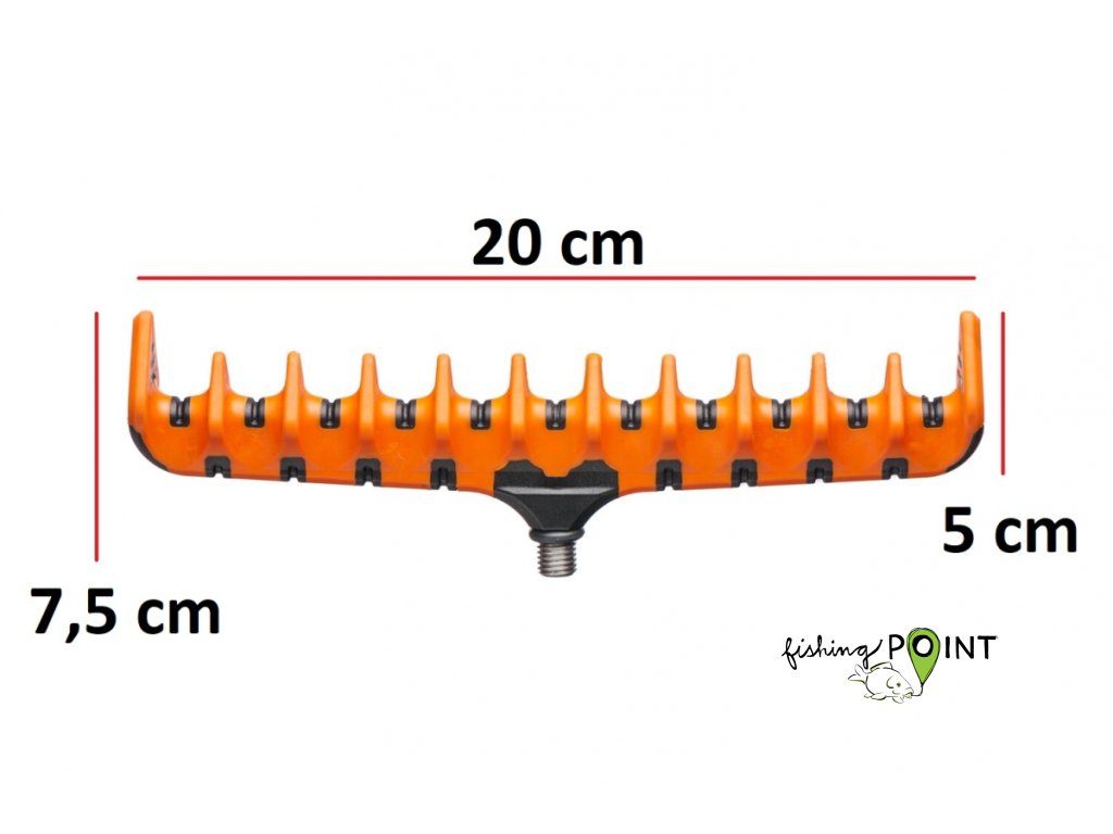 Kvalitní široká přední podpěra pro lov na method / feeder. Výrazné výstupky bezpečně drží prut ve zvolené pozici i ve větru, silném proudu či při prudkém záběru. Drobné výřezy v každé pozici usnadňují průchod vlasce mezi podpěrou a blankem prutu. Její konstrukce je velmi pevná a stabilní. Zároveň je vybavena SoftTouch měkčeným povrchem, který chrání povrch prutu před poškrábáním. Podpěra je osazena kvalitním mosazným závitem, kompatibilním se všemi standardními vidličkami, držáky a rameny.Rozměr