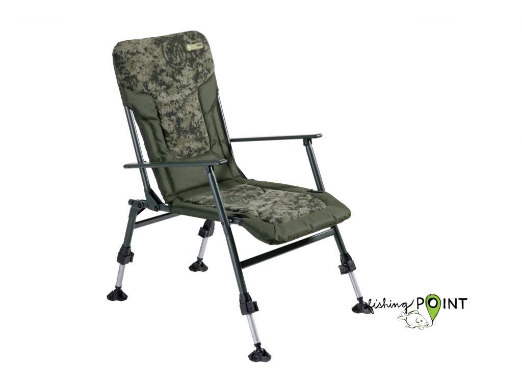 Kompaktní, avšak mimořádně stabilní a robustní křeslo se čtyřmi teleskopickými nohami a pevnými područkami. Minimální transportní rozměry jej předurčují pro kratší vycházky a rybolov na hůře přístupných místech. Nijak však nesnižují jeho celkovou pevnost ani nosnost. Díky speciálně tvarovanému rámu sedáku nabízí toto křeslo nečakaně pohodlné sezení. Samovýsuvné teleskopické nohy jsou vybaveny výkyvnými patkami proti zaboření.Rozměr sedací části (šířka x délka): 48 x 48 cmRozměr zádové části (šířka x délka): 48 x 56 cmVýška sedáku od země (od - do): 30 - 41 cmTransportní rozměr: 72 x 65 x 14 cmHmotnost: 5,3 kgBarva: digitální camoNosnost : 140 kgRozměr: Rozměr područek 42 x 4 cmVýška: Maximální výška rozloženého 91 cm