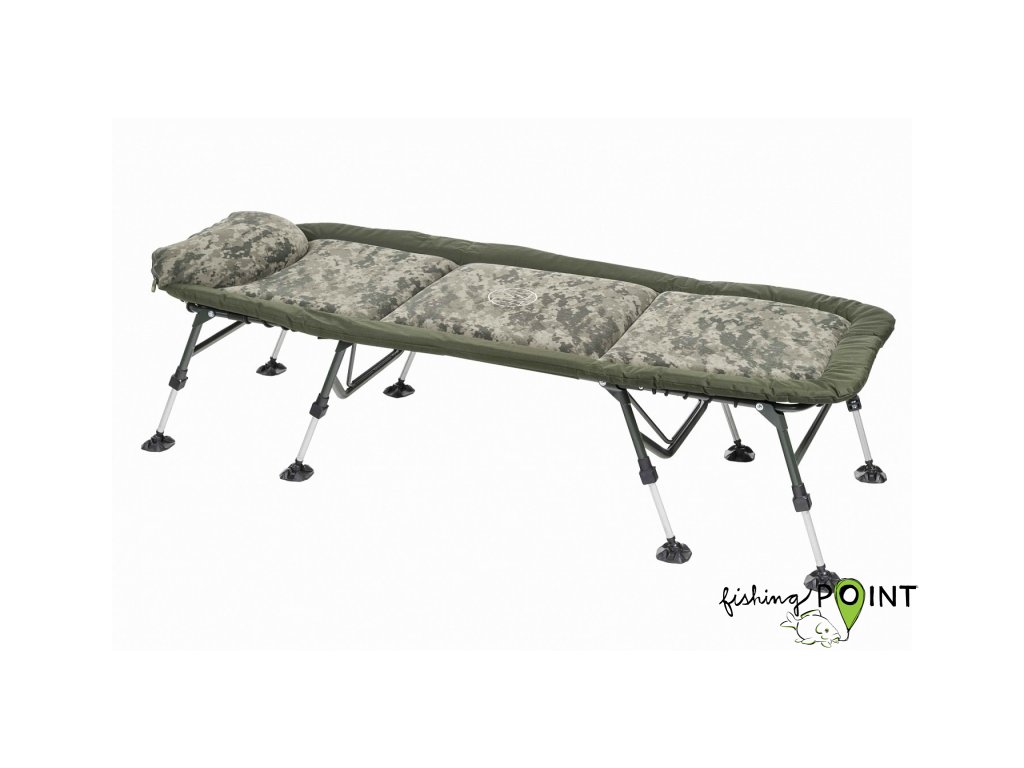Extrémně lehké, velké a 100% ploché lehátko ve velice atraktivním designu s digitálním maskováním. Nadstandardně silná a velmi komfortní matrace s fleecovou vrchní vrstvou nabízí nejúčinnější systém regulace tuhosti pomocí elastického šněrování na spodní straně. Další výhodou jsou nohy s rozměrnými výkyvnými patkami a možností velkého vysunutí. Lehátko je dostupné ve variantě s osmi nebo se šesti nohami.Výška sedáku od země (od - do): 37 - 52 cm