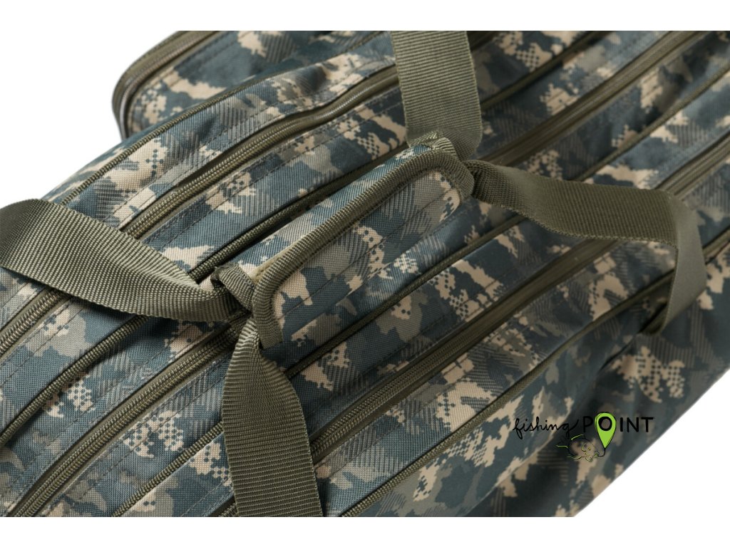 Přepracované série tříkomorových obalů na pruty v různých délkách pro přepravu teleskopických prutů nebo dělených kaprových či feederových prutů ze 100% nepromokavého materiálu v atraktivním maskovacím designu, odolného proti protržení. Jsou vybaveny luxusními polstrovanými popruhy, kvalitními doplňky i novými luxusními táhly Mivardi. 2x Dlouhá kapsa 100 x 8 x 3 cm2x Boční kapsa 24 x 15 x 4 cm3 pruty s navijáky2 + 2 popruhy