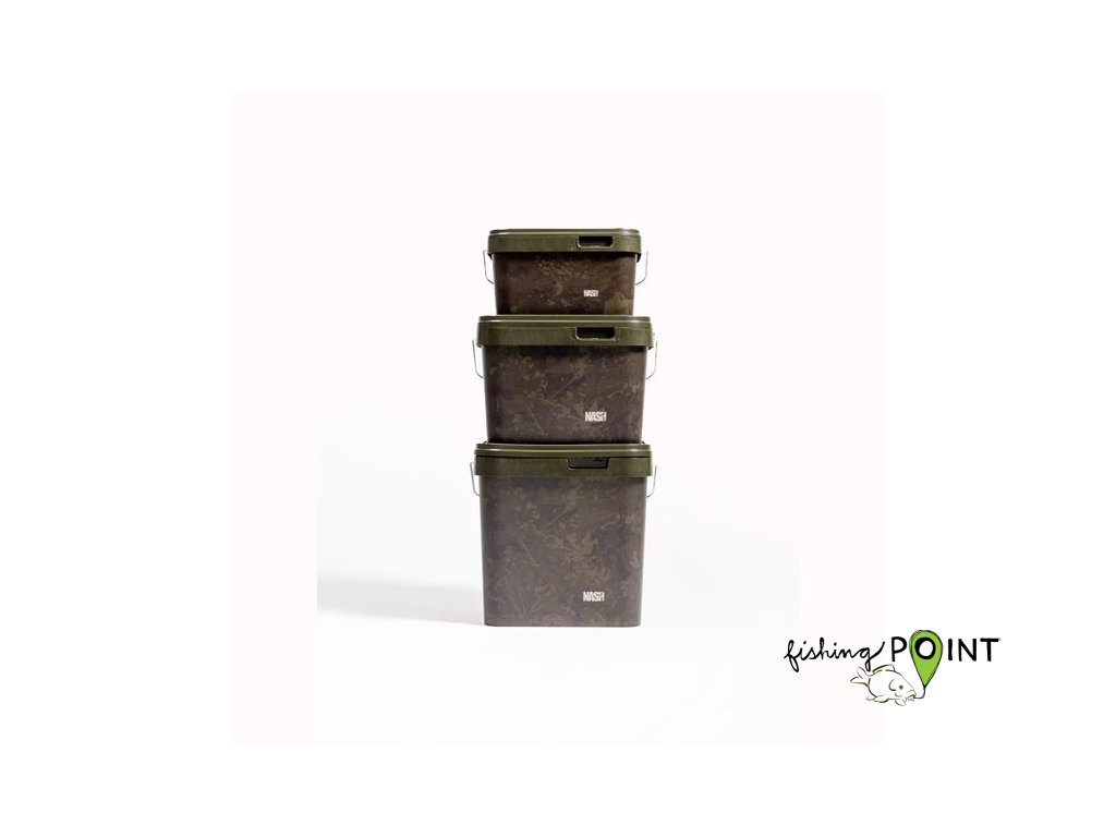 Pevné, nerozbitné čtvercové kbelíky pro prostorově efektivní uložení návnad.Povrch s unikátní kamufláží firmy NASH s legendárními jezery.