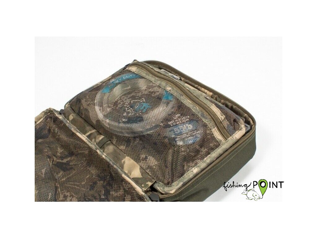 Jeden z nejoblíbenějších produktů Nash. Nyní je v camo vzoru s vylepšenými prvky a funkcemi. Otevřený design s velkým úložným síťovaným prostorem na zip, centrálním úložným prostorem a prostorem určeným pro uložení Medium tackle boxu. Středová přepážka nabízí 15 síťových kapes pro uspořádání všech Nash háčků a další bižuterie Nash. Dále zde najdete velkou kapsu na zip pro uložení PVA, pomůcek pro navazování návazců, značící fixy a cívky s vlasci. Jsou zde i dvě elastické smyčky pro uložení Vašich pomůcek pro broušení háčku Pinpoint Precision Sharpening File.