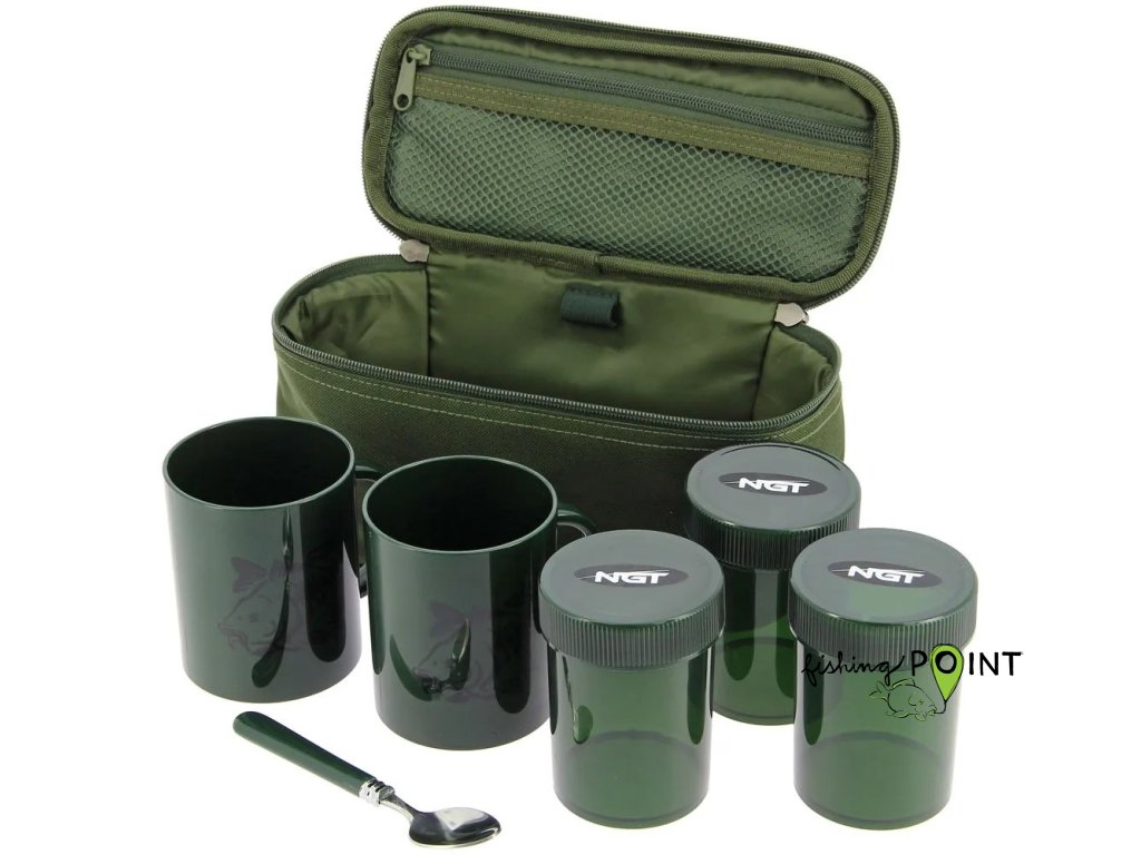 Kompaktní a velice praktická sada pro přípravu teplých nápojů mimo pohodlí domova. Tato nápojová souprava obsahuje celkem 3 uzavíratelné dózy( ideální na kávu, cukr, sypaný šaj... ) samozřejmě nechybí standartní 2 hrnky a čajové lžičky. Kompletní sada je dodávána a bezpečně uložena v textilním pouzdře s vnitřní kapsou na zip.
