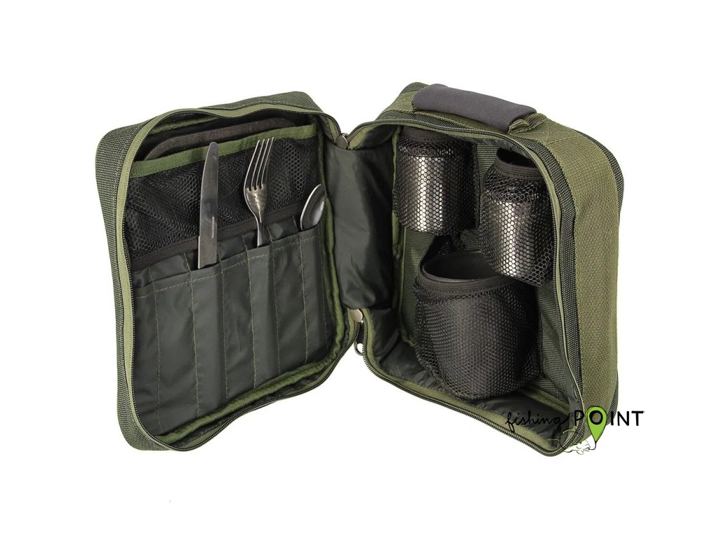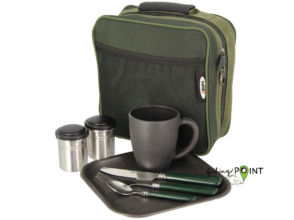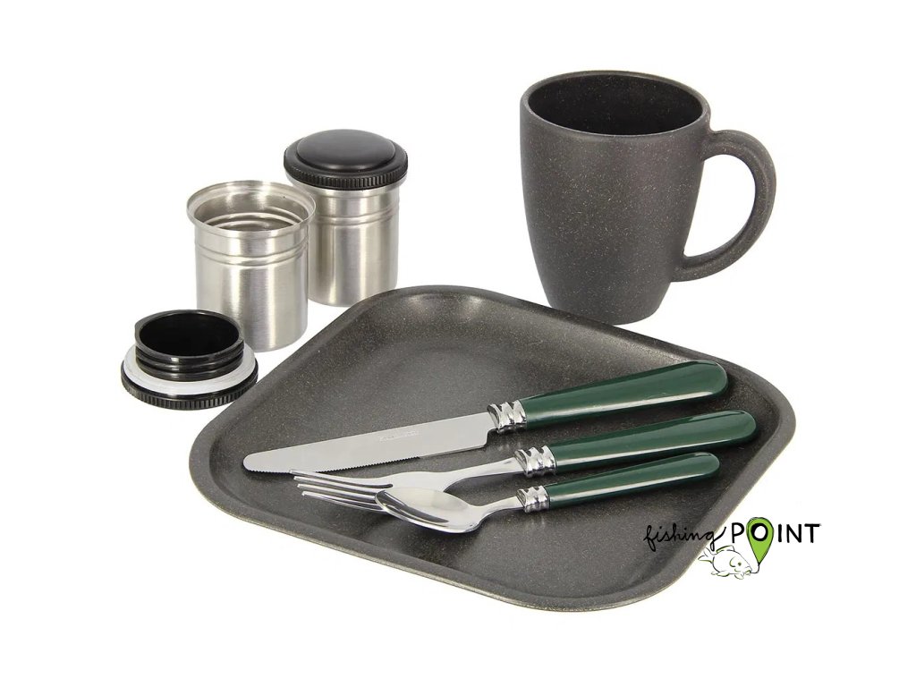 Praktická sada nádobí pro jednoho – ideální na delší sólové výpravy k vodě nebo do přírody.Set obsahuje vše, co potřebujete pro pohodlné stolování během rybářské nebo kempingové výpravy.Obsah sady:2× nerezová dóza na cukr/kávu/čaj1× hrnek1× nůž1× vidlička1× čajová lžička1× talíř1× dvoubarevné zelené pouzdro se síťovanou kapsou a madlem pro snadné přenášení