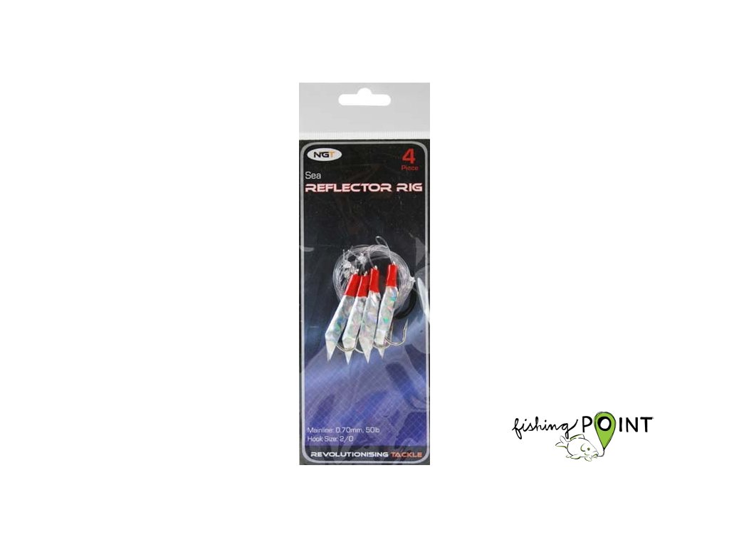 Balení čtyř kusů montáže Sea Reflector Rigs. Určeno pro mořský rybolov. Vázáno na čirý vlasec 0,70 mm / 50 lb, háčky velikost 2.Doplňkové parametry