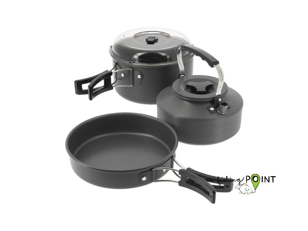 Kompaktní set nádobí ideální pro rybáře a outdoorové nadšence. Set se skládá z konvičky, hrnce s víkem a pánvičky. Vše je vyrobeno z lehkého, eloxovaného hliníku, a vše přesně pasuje do sebe. Díky silnější hliníkové vrstvě pánve i hrnce, byla umožněna kvalitnější nepřilnavá úprava. Pánve mají odolné skládací rukojeti, které umožňují velmi kompaktní složení.