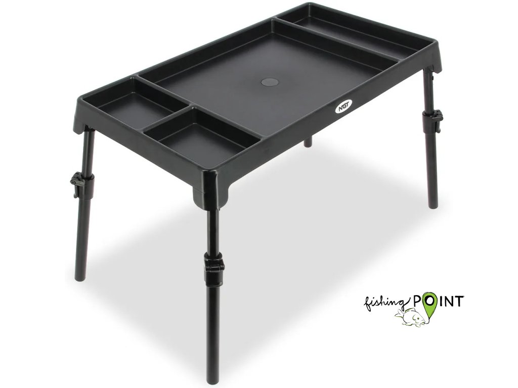 NGT Stolek XPR Bivvy Table je nový, velice prakticky dělěný, plastový stolek do bivaku primárně určený pro přípravu montáží a návazců. Dělený znamená, že jeho pracovní plocha je rozdělena na 4 různě velké části pro vyskládání všemožné bižuterie a potřeb pro navazování. Díky vysoké hraně kolem celého obvodu stolku nehrozí, že se Vám bižuterie a drobnosti rozkutálí a poztrácí se. Samozřejmostí jsou nastavitelné teleskopické nohy s výškou od 29 do 40cm.NGT stolek do bivaku určený pro přípravu montáží a návazců