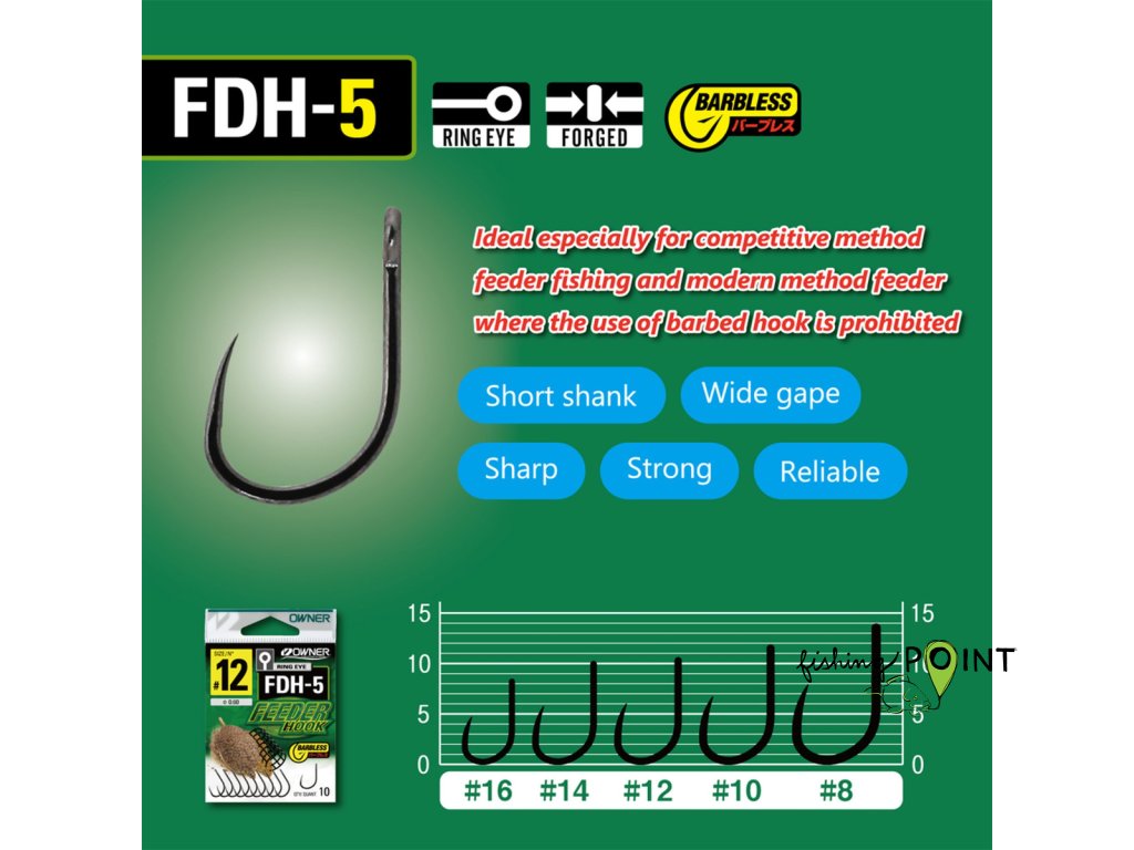 Owner FDH-5 Barbless Iseama s očkem - Black ChromeBezprotihrotový háček pro method feeder, navržený speciálně pro evropské revíry a závodní podmínky. Díky širokému zahnutí (wide gape) a krátkému, silnému ramínku zajišťuje spolehlivý a agresivní zásek i bez protihrotu.Přímé očko umožňuje snadné vázání na šňůry a přispívá k rychlé reakci při záběru. Háček je vyroben z pevného drátu s chemicky ostřeným hrotem a dlouhou životností.Vlastnosti:· Bezprotihrotový (barbless)· Chemicky ostřený rovný hrot· Kovaná uhlíková ocel· Povrchová úprava: Black Chrome· Vhodný pro šňůry, monofil i fluorocarbon· Ideální pro pelety, waftery a miniboiliesSkvělá volba pro method feeder na kapry a velké ryby tam, kde je použití bezprotihrotových háčků povinné.Doplňkové parametry