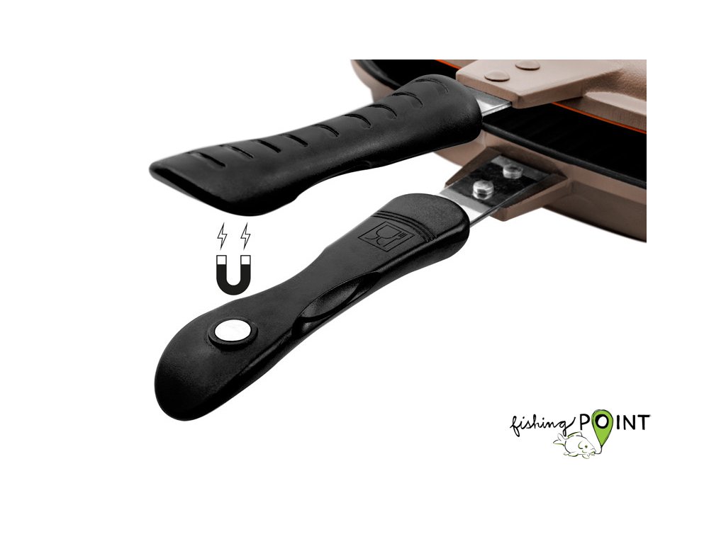 Díky magnetu na rukojeti jednotlivé poloviny po uzavření výborně drží spolu a pánev tak můžete během přípravy pokrmu libovolně obracet. O dokonalou těsnost se přitom stará obvodové těsnění odolné vysokým teplotám. Jednoznačně největší výhodu uzavřené pánve je fakt, že teplo se uvnitř mnohem rychleji akumuluje a během vaření neuniká z pánve ven. Díky tomu je příprava jídla v přírodě mnohem rychlejší a jednodušší.