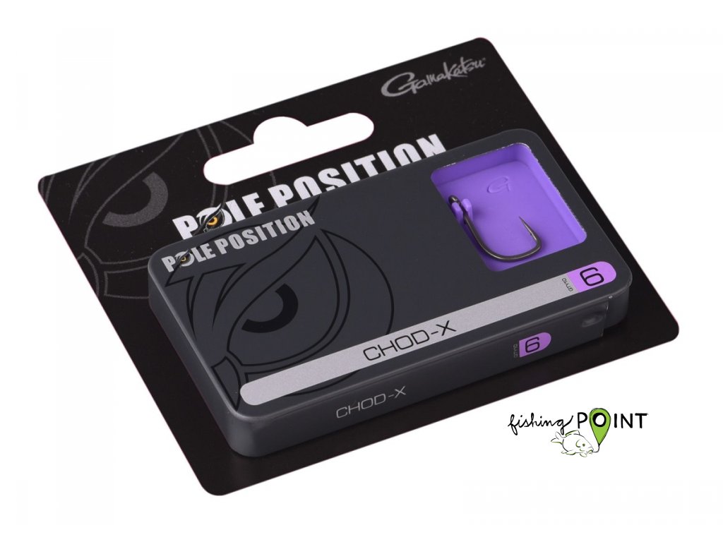Tyto háčky byly vyvinuty ve spolupráci s největším Japonským výrobcem háčků firmou Gamakatsu a navrhnuty naším vývojářským týmem Pole Position. Toto vede k háčkům, které excelují silou, designem a především ostrostí. Kombinace velmi dlouhého, rovného hrotu (s micro protihrotem), středně dlouhého ramínka a lehce dovnitř zahnutého očka, dělá tento háček extrémně agresivním. Idelální je tento háček při použití montáží Chod/stiff rig. Materiál k navázání těchto montáží je často velmi silný, ale díky extra velkému očku háčku Chod-x nebude žádný problém tyto montáže navázat.V balení 10ks