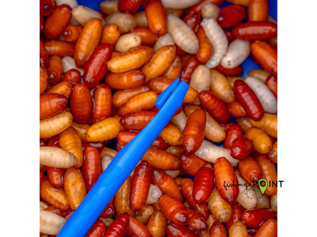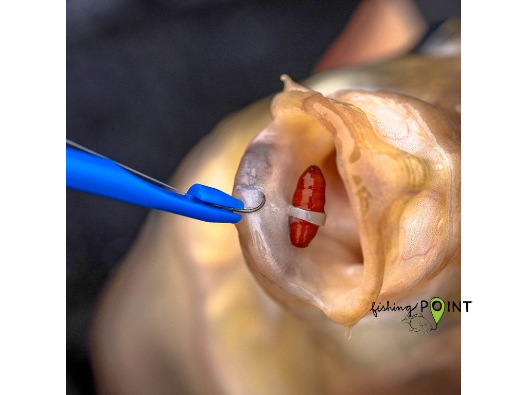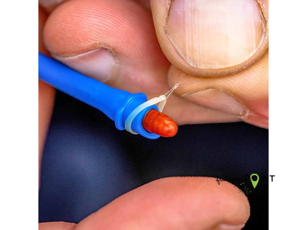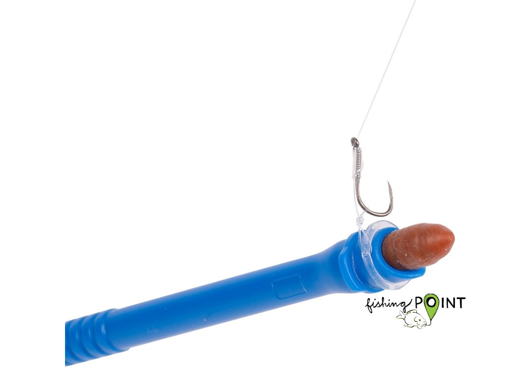Navlékač gumiček je vybaven prohlubní, do které se zasunou nástrahy, jako jsou kukly nebo 4mm pelety, a gumička se pak snadno nasune na nástrahu.