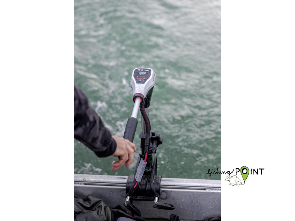 Displej při provozu zobrazuje stav nabití baterie. Motor ještě disponuje USB připojením pro nabíjení telefonů a baterek. Kormidlo je výsuvné, tyč zhotovena z ušlechtilé oceli. Prostřednictvím stlačení páčky lze motor vyklopit směrem nahoru, hloubku ponoření vrtule do vody a také tuhost řízení je možné plynule nastavit. Ideální stroj pro náročné rybáře lovící z lodi.