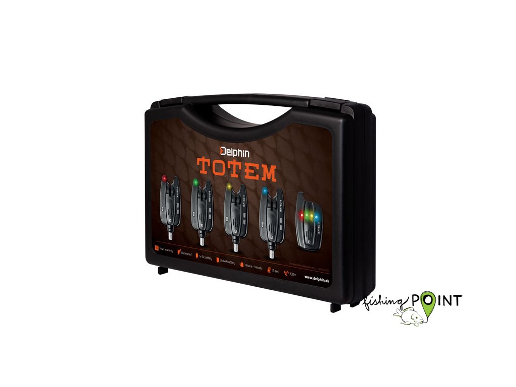 Extrémně kompaktní rozměry signalizátoru a přijímače v ergonomickém tvaru. Delphin TOTEM nabízí úplnou voděodolnost signalizátoru a přijímač se skvělým dosahem až 150m v závislosti na okolních podmínkách. Signalizátor má ultra jasnou LED diodu s velmi dlouhou výdrží. Je napájen 9V baterií, což zajišťuje jeho dlouhou dobu provozu. Dobrou vychytávkou je alarm, který krátkým pípnutím a svícením LED diod upozorní na snížení stavu kapacity baterie pod 5V (rovněž pípne i přijímač). TOTEM nabízí možnost otestování všech jeho funkcí. Má 4 úrovně hlasitosti včetně tichého režimu, 4 různé tóny a 4 úrovně citlivosti. Ve tmě jistě oceníte možnost zapnutí noční diody. Vstup pro 2,5mm jack umožňuje připojení svítícího signalizátoru záběru. Silné pogumování v části kontaktu prutu se signalizátorem zamezuje poškození prutu. Signalizátor po záběru svítí 15 sekund (také přijímač). Přijímač je napájen 3 kusy AAA batérií. Na zadní straně má umístěný odepínatelný klip pro upevnění například za opasek. Samozřejmostí je tvrdý transportní kufřík pro bezpečný transport a ochranu sady mimo sezónu, tento kufřík pojme sadu až do konfigurace 4 + 1. Přijímač má 5 úrovní hlasitosti včetně tichého módu a možnost nastavení 4 úrovní tónu. TOTEM je kvalitní signalizátor se všemi funkcemi, které využijete při rybaření. Noční LED dioda, voděodolný alarm i přijímač či test funkcí s upozorněním na slabé baterie. To je jen pár výjimečných funkcí signalizátoru Delphin TOTEM.