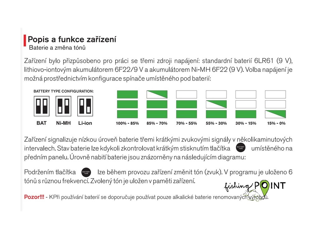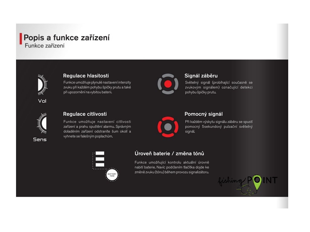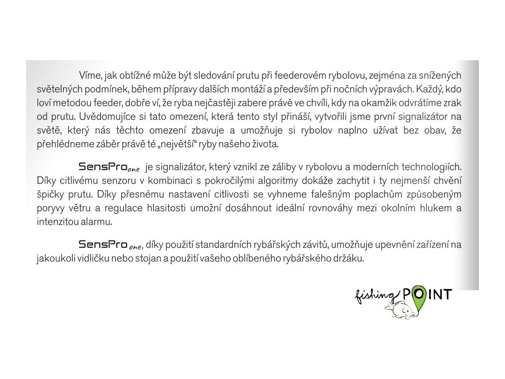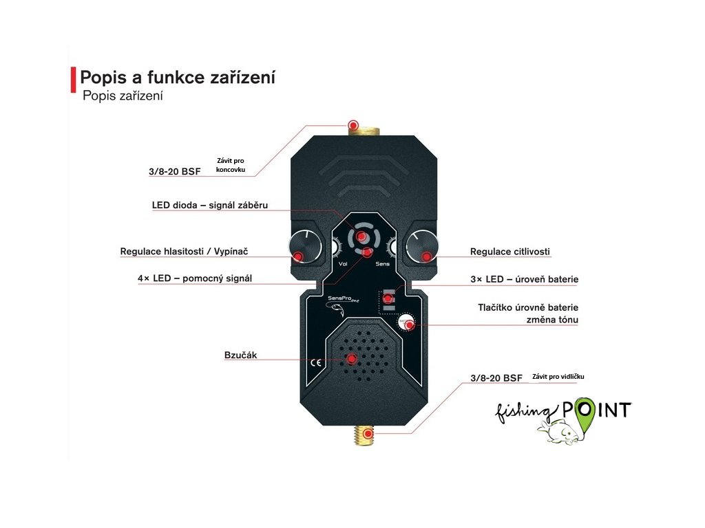 SensPro One – První signalizátor záběru na světě pro Method Feeder!Toto není obyčejný signalizátor!Většina signalizátorů na trhu detekuje pohyb vlasce, ale SensPro One funguje jinak!Naše inovativní řešení přímo registruje vibrace špičky, což umožňuje rychlejší a přesnější signalizaci záběru při metodě Method FeederDíky tomu máte plnou kontrolu a nepropásnete žádnou příležitost k úspěšnému záběru!Klíčové funkce:Nastavení hlasitostiNastavte si hlasitost, která vám nejvíce vyhovuje. Chcete vypnout zvuk a spoléhat se pouze na světelné signály? Hotovo! Otočte knoflík zcela doleva.Nastavení citlivosti:Ideální citlivost pro každý záběr – od jemného škubnutí po silné trhnutí! Díky přesnému snímači vibrací a plnému nastavení vám náš signalizátor poskytuje výjimečné pohodlí a jistotu, takže se můžete soustředit pouze na úspěšný lov.Stav baterie:Zařízení informuje o nízkém stavu baterie třemi krátkými zvukovými signály. Navíc po stisknutí tlačítka Battery/Tone můžete zkontrolovat aktuální stav nabití.Změna tónu:Podržením tlačítka Battery/Tone můžete změnit tón zvuku zařízení. K dispozici je 6 tónů s různou frekvencí. Vybraný tón se uloží do paměti zařízeníNapájení: