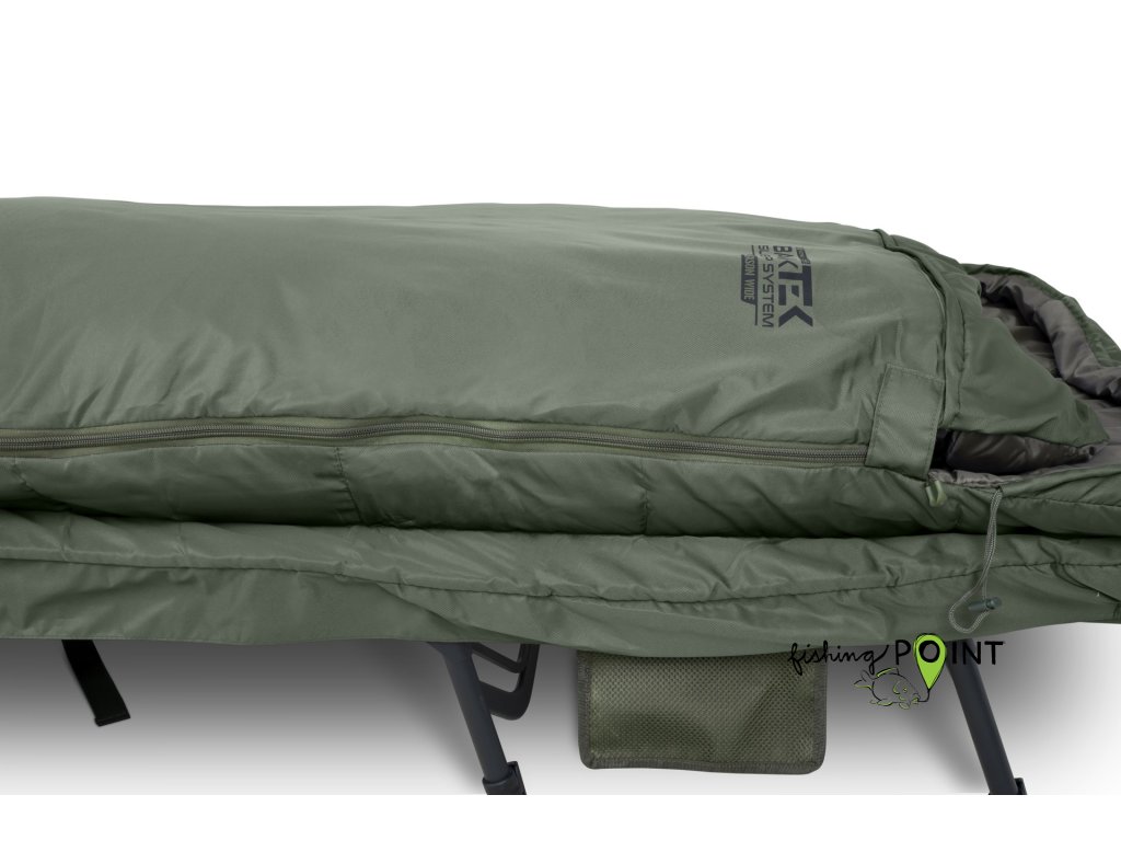 Spací systém Bank-Tek 5 Season je teplejší, lehčí a nabitý funkcemi. Je vyroben z voděodolné, odolné a prodyšné tkaniny 190T ripstop. Vysoce kvalitní silikonem ošetřené duté vlákno udržuje maximální teplo. Nový design umožňuje spacímu pytli přizpůsobit se vašemu tělu bez ohledu na oblíbenou spací polohu. Horní část je podšitá fleecem pro větší tepelný komfort, zatímco hladká polyesterová podšívka spodní části umožňuje snadný pohyb uvnitř pytle. Doplňková hladká polyesterová ochrana krku pomáhá zabránit odírání a chladným místům. Hlava i nohy spacáku mají stahovací šňůrky, které umožňují zesílení izolace pro příjemně teplý spánek. Posledním praktickým doplňkem je široká skládací moskytiéra, která se skvěle hodí na klidné letní noci pod hvězdami.Lehátko má rám vyrobený z oceli a hliníku se 100 % rovným profilem. Nohy jsou široce rozložené a každá má krátkou opěrnou část pro větší pevnost a stabilitu. Výšku lze snadno a bezpečně nastavit díky mechanismu Grip-Lok™. Nohy jsou navíc zpevněny dvojitými trubkami a opatřeny velkými otočnými patkami do bláta. Dvojité skládací panty umožňují kompaktnější složení spacího systému. Všechny šrouby, podložky a upevňovací prvky jsou z nerezové oceli, což zajišťuje lehkost i pevnost. Zárověň jsou na bocích dvě praktické úložné kapsy, ideální na telefon nebo klíče od auta.