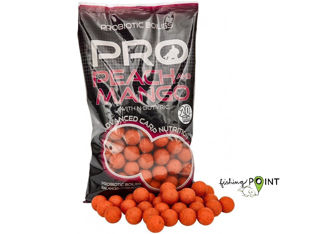 PRO PEACH & MANGO with N-BUTYRIC (broskev & mango s kyselinou máselnou)Série PROBIOTIC boilies byla původně vyvinutá speciálně pro anglický trh hlavně na krátké výpravy a rychlý závodní rybolov. Díky těmto vlastnostem si však brzy získala enormní věhlas v celé Evropě.Ovocná receptura vyznačující se až omamnou vůní sladkého zralého manga a šťavnatých broskví v atraktivní růžovo-oranžové barvě, která zaujme i apatické ryby. Celkové silné aroma ještě umocňuje přídavek kyseliny máselné. TOP boilies na vody, kde fungují nástrahy na ovocné bázi.Složení:- sladké aroma manga a broskve, kyselina máselná- rychle rozpustný játrový prášek, betain a kvasnice- jemné moučky ze semen bohaté na minerály a olejeObdobí:celoroční rybolov (výborně funguje v chladné vodě)Vnadění:- středně masivní vnaděníSelektivita ryb:- univerzální nástraha na velké i menší kapryRychlost nástrahy:- rychlá nástraha na kratší výpravy a závodní rybolov