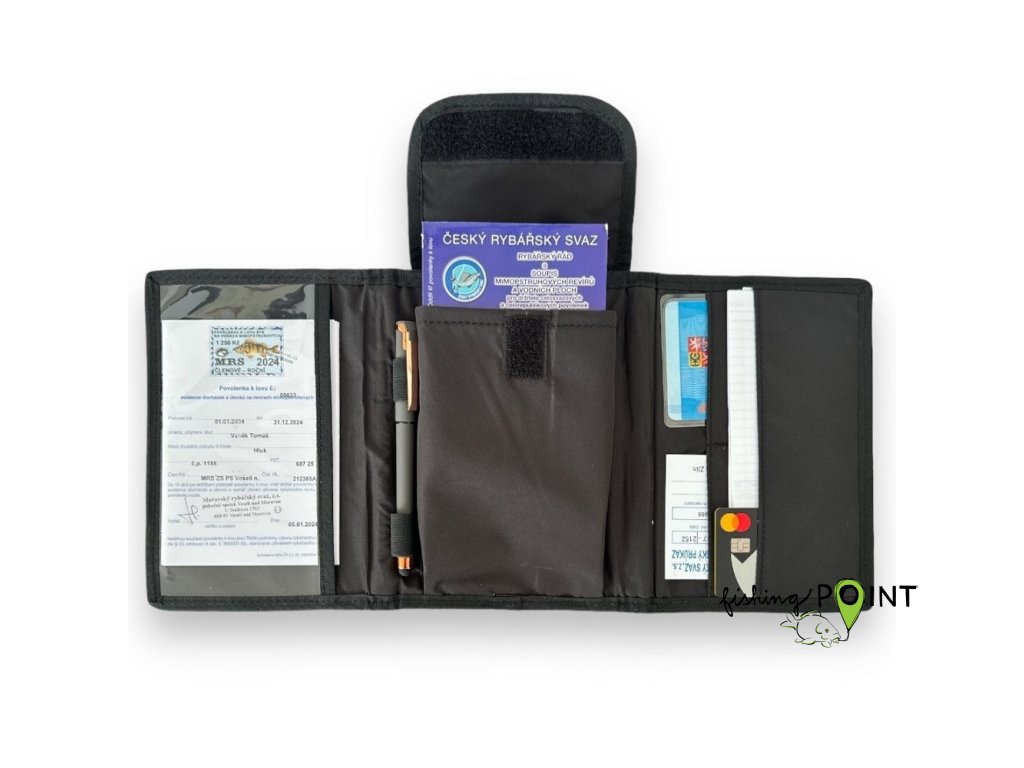 Pouzdro je rozděleno do tří segmentů, uprostřed pouzdra se nachází velká kapsička se zajištěním proti vypadnutí pro rybářský řád a soupis pro držitele celosvazových a celorepublikových povolenek, ale je možné ji využít i pro vložení smartphonu o uhlopříčce 6,7" a více, dále se zde nacházejí gumová poutka na vložení pera. Na levé straně se nachází jedna velká slídová kapsa pro vložení například dokladů nebo rybářského řádu. Na pravé straně je prostor pro vložení například členského průkazu, rybářského lístku, příručního kalendáře, sumáře, kreditní karty a jiných drobných věcí.