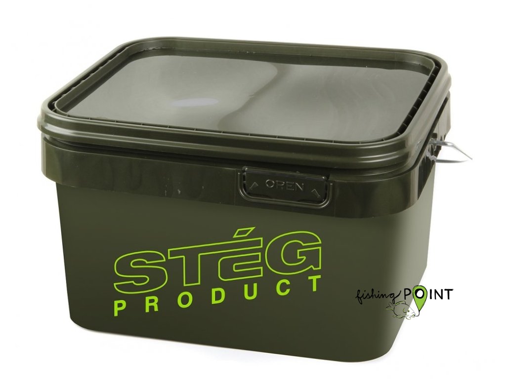 Olivově zelené kbelíky s logem firmy Steg o objemech 5 litrů a 10 litrů jsou praktickým a stylovým doplňkem pro každého rybáře.