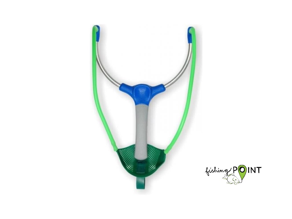 Velký prak s kovovými vidlicemi a zelenou dutou silikonovou gumouv pro krmení na velké vzdálenosti.Doplňkové parametry
