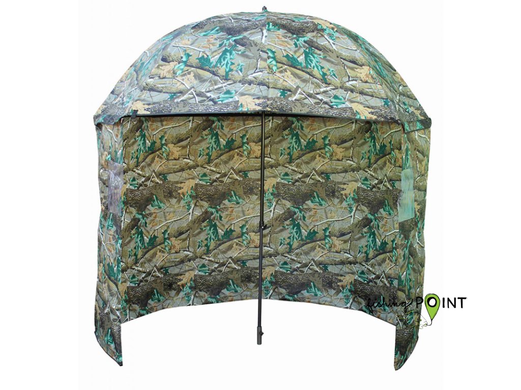 Deštník s bočnicí s krásným a moderním camo vzorem je vyrobený z 210D materiálu s podlepenými švy. Po obvodu vrchlíku jsou čtyři očka k ukotvení, deštník je dodáván se čtyřmi stavitelnými provazy a kolíky. Vrchlík lze naklopit pomocí kovového kloubu, žebra jsou z ocelových drátů 1,25m dlouhých, eloxovaných černou barvou. Středová tyč je teleskopická s novým, velmi spolehlivým adaptérem, který vnitřní trubku svírá po celém obvodě. Průměr rozloženého deštníku je 200cm, výška bočnice 140cm. Transportní délka je 1.35 m, váha 3.1 kg. Deštník je dodáván v přepravním obalu.