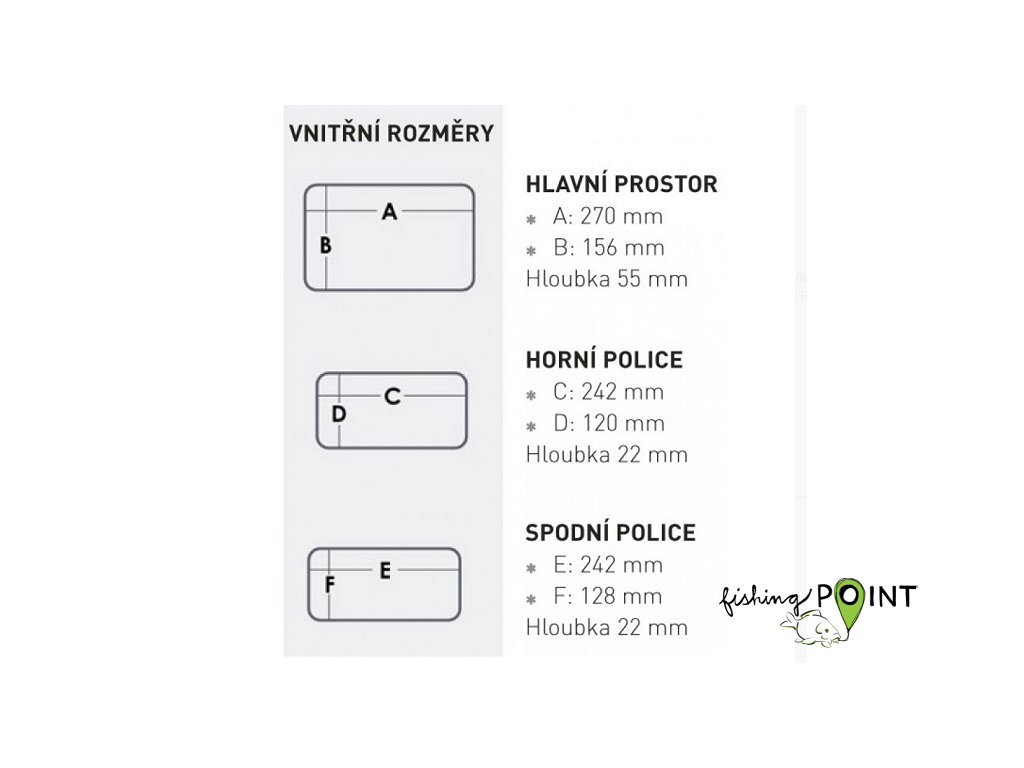 Dvě poličky, v hlavním prostoru jsou 4 příčky na ukládání třpytek, pilkrů a wobblerů. Materiál: Nárazuvzdorný kopolymer. Přihrádky Worm Proof.Rozměry