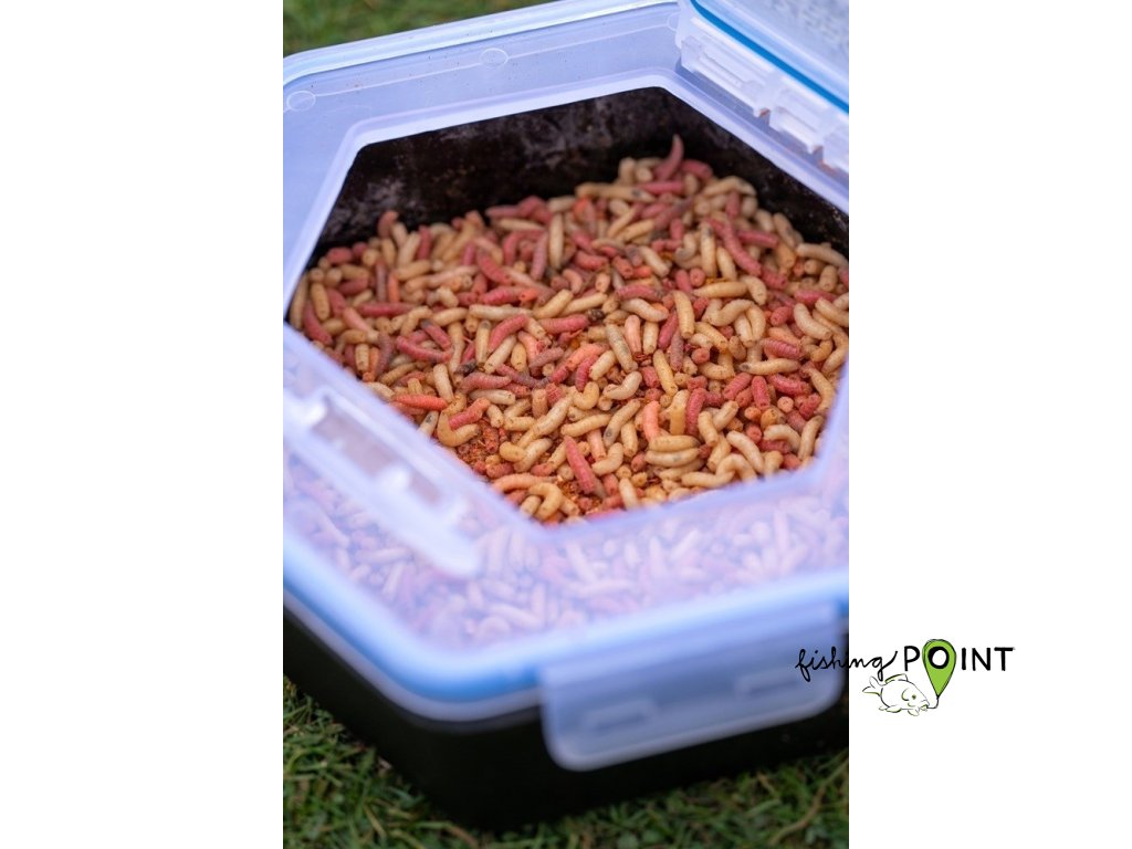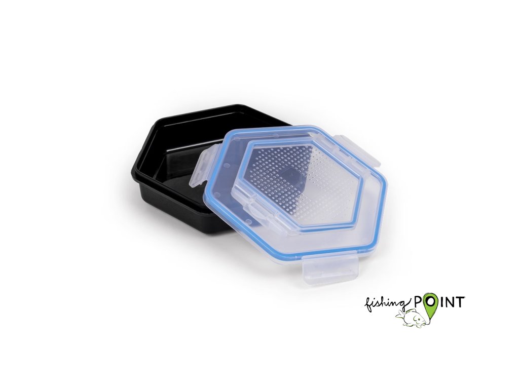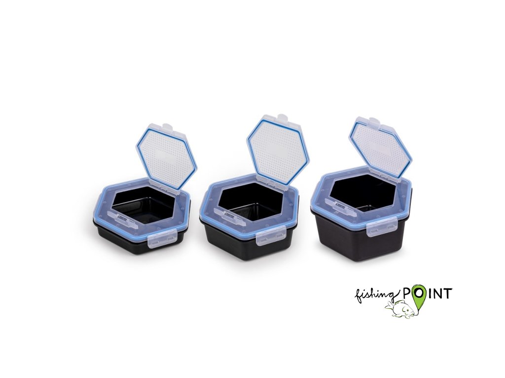 Pevná konstrukce víka s klipem bezpečně zaklapne na všech čtyřech stranách. Každé víko má zabudovaný únikový poklop a zúžené vzduchové otvory, které zabraňují úniku nástrahy. Každá krabička na nástrahy má ve tmě svítící gumové těsnění. Víčka jsou univerzální pro všechny velikosti krabiček. Odolný vstřikovaný polypropylen.Uzamykatelné pozice na dně krabičky pro stohování při skladování.Dostupná v objemech: 1l, 1,5l a 2l.